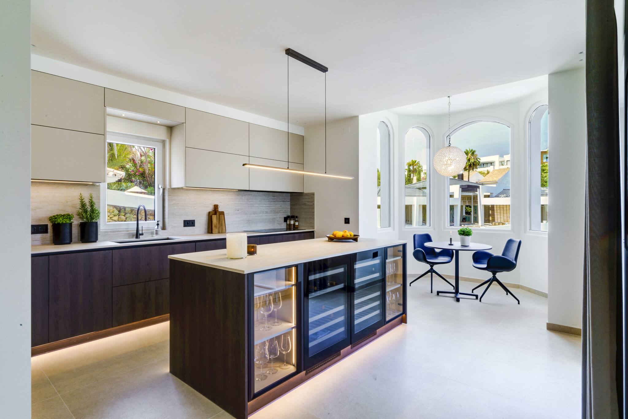 Im Inneren bietet die Villa großzügige und helle Wohn- und Essbereiche, perfekt für gemeinsame Stunden mit Familie und Freunden. Die moderne Küche verfügt über einen gemütlichen Sitzbereich, außerdem befindet sich auf dieser Etage ein Gäste-WC.