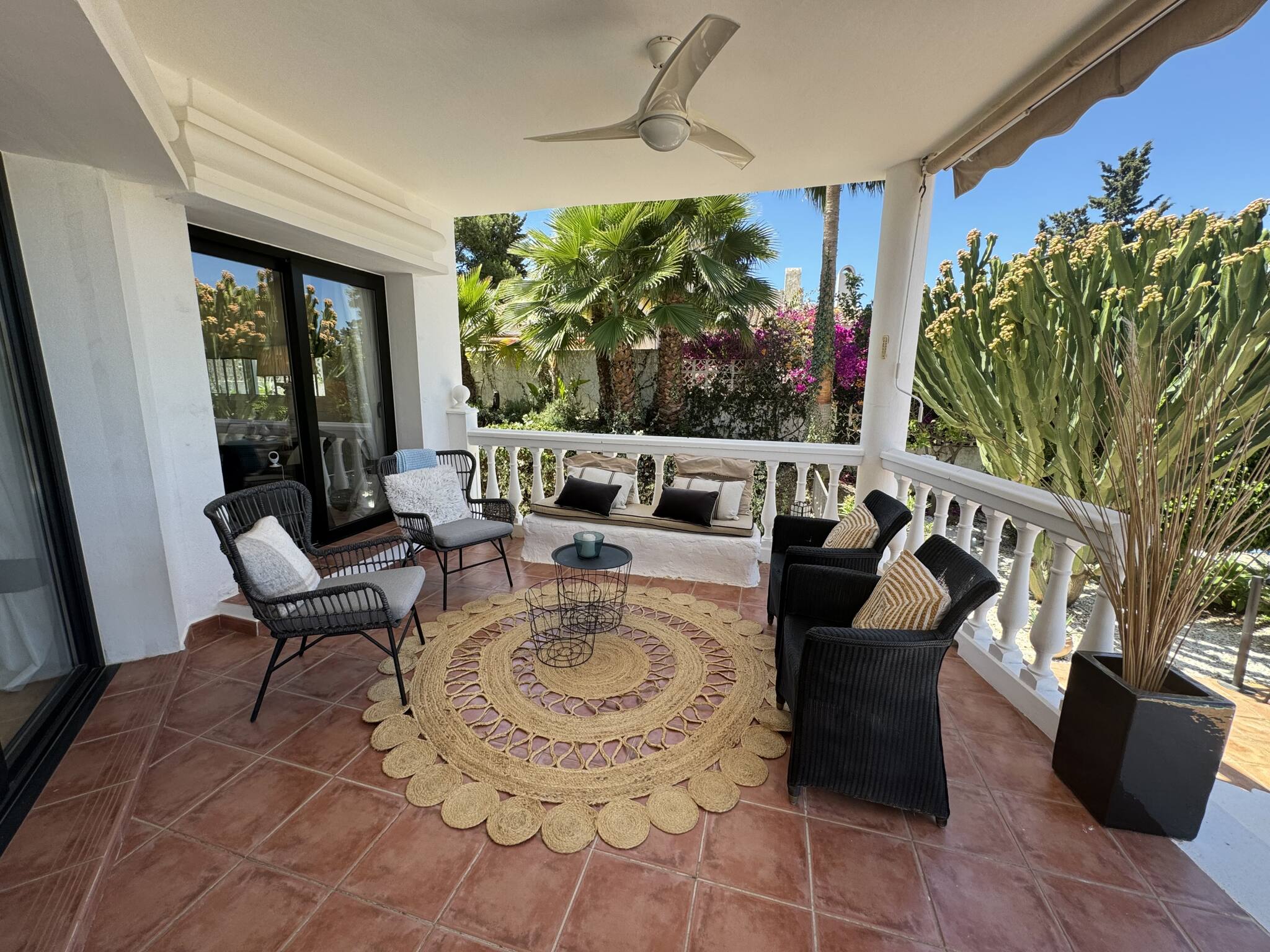 Charmante Villa im Osten von Marbella, nur 10 Autominuten vom Stadtzentrum entfernt, hochwertig renoviert. Das Anwesen erstreckt sich über drei Etagen, liegt auf einem sonnigen, flachen Grundstück und verfügt über einen Garten mit Swimmingpool und Chill-out-Bereich.