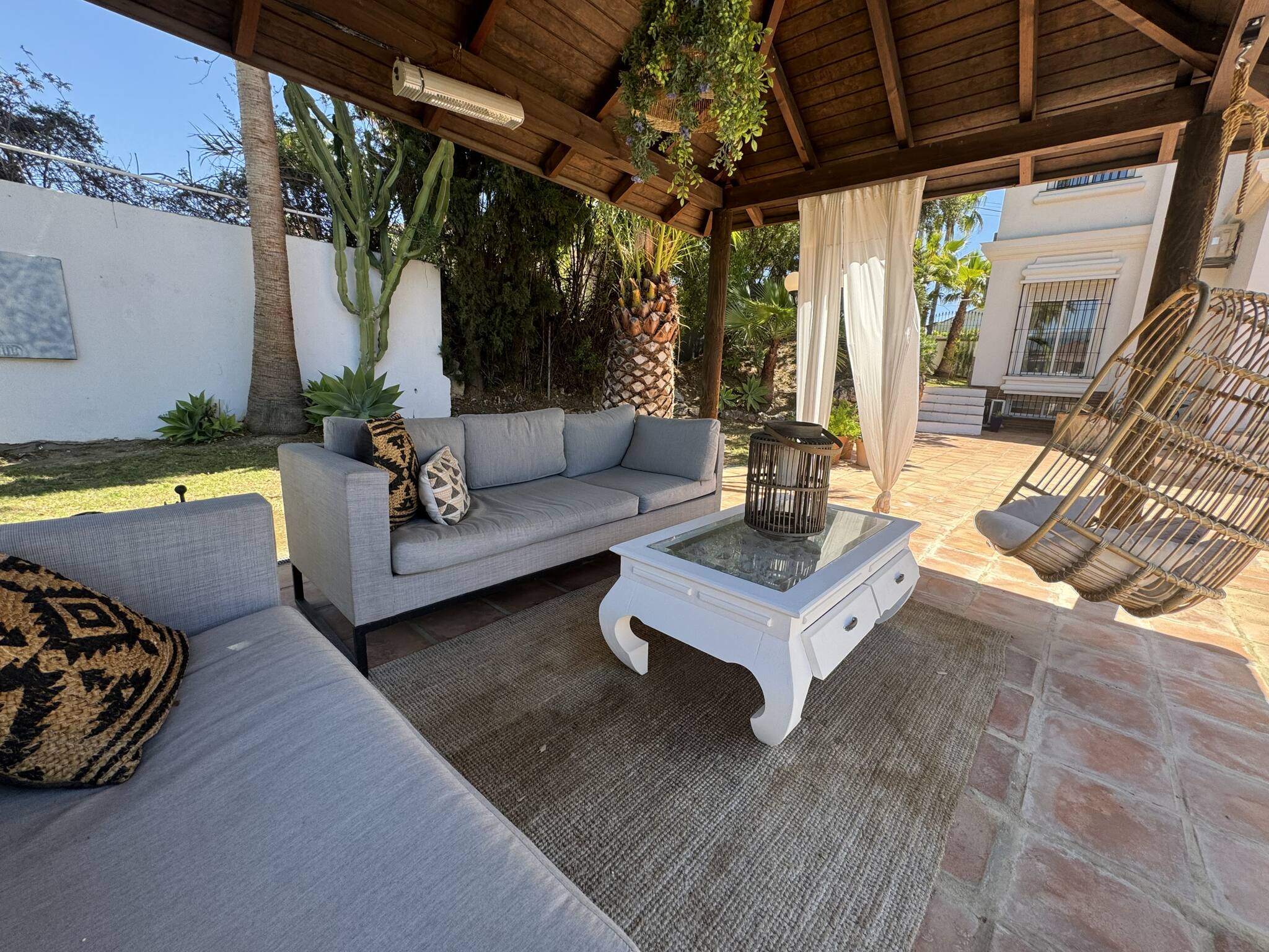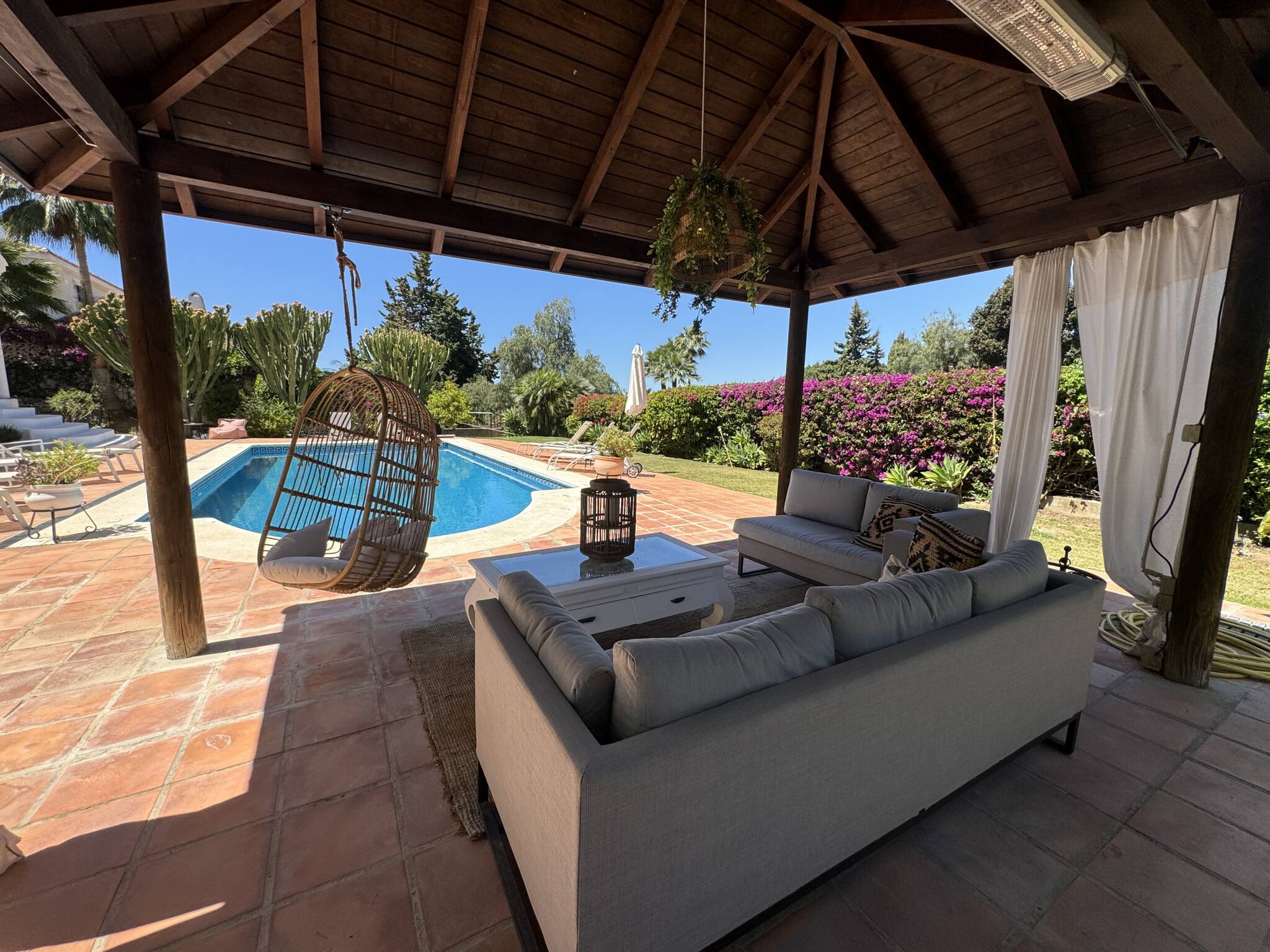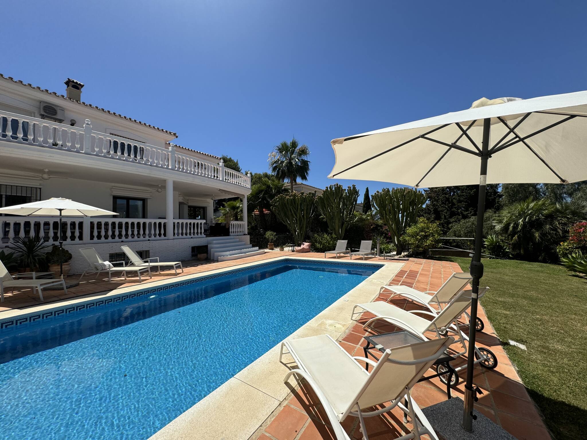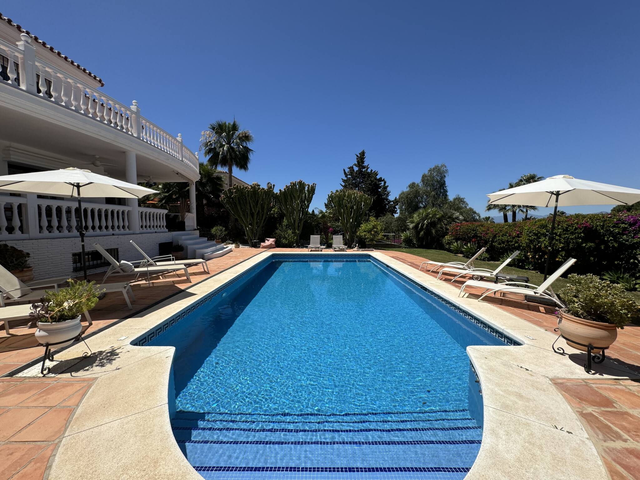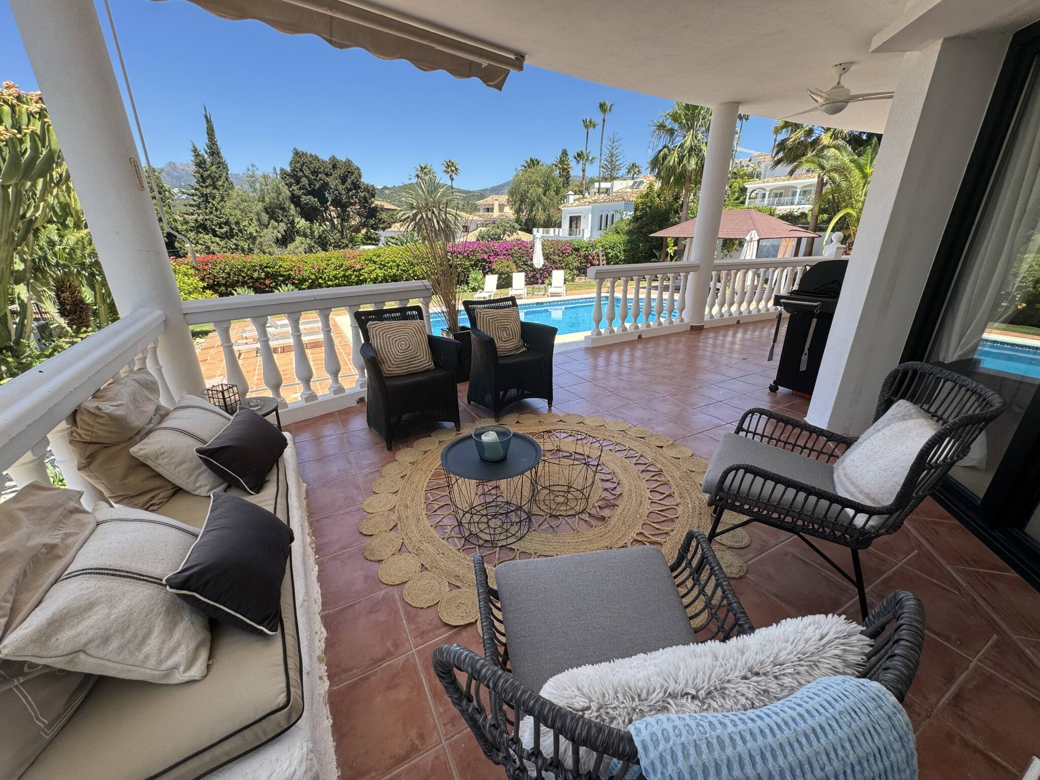 Es bietet ein großzügiges und helles Wohn-Esszimmer mit Kamin sowie eine offene, voll ausgestattete Küche. Von der großen überdachten Terrasse aus hat man direkten Zugang zum Garten und Poolbereich. Die Terrasse verfügt über einen Grill- und Essbereich im Freien mit herrlichem Blick auf die Bucht von Marbella. Die Villa verfügt über fünf schöne Schlafzimmer mit eigenem Bad, fünf Badezimmer und ein zusätzliches Gäste-WC. Außerdem gibt es ein Untergeschoss-Apartment mit Tageslicht, separatem Eingang, Küche, Bad, Wohnzimmer und Schlafzimmer. Die Immobilie bietet zudem ein Fitnessstudio und eine Sauna. Privater überdachter Parkplatz für zwei Autos. Es gibt mehrere überdachte und offene Terrassen sowie eine Veranda mit Garten. Eine Immobilie voller Ruhe und Harmonie.