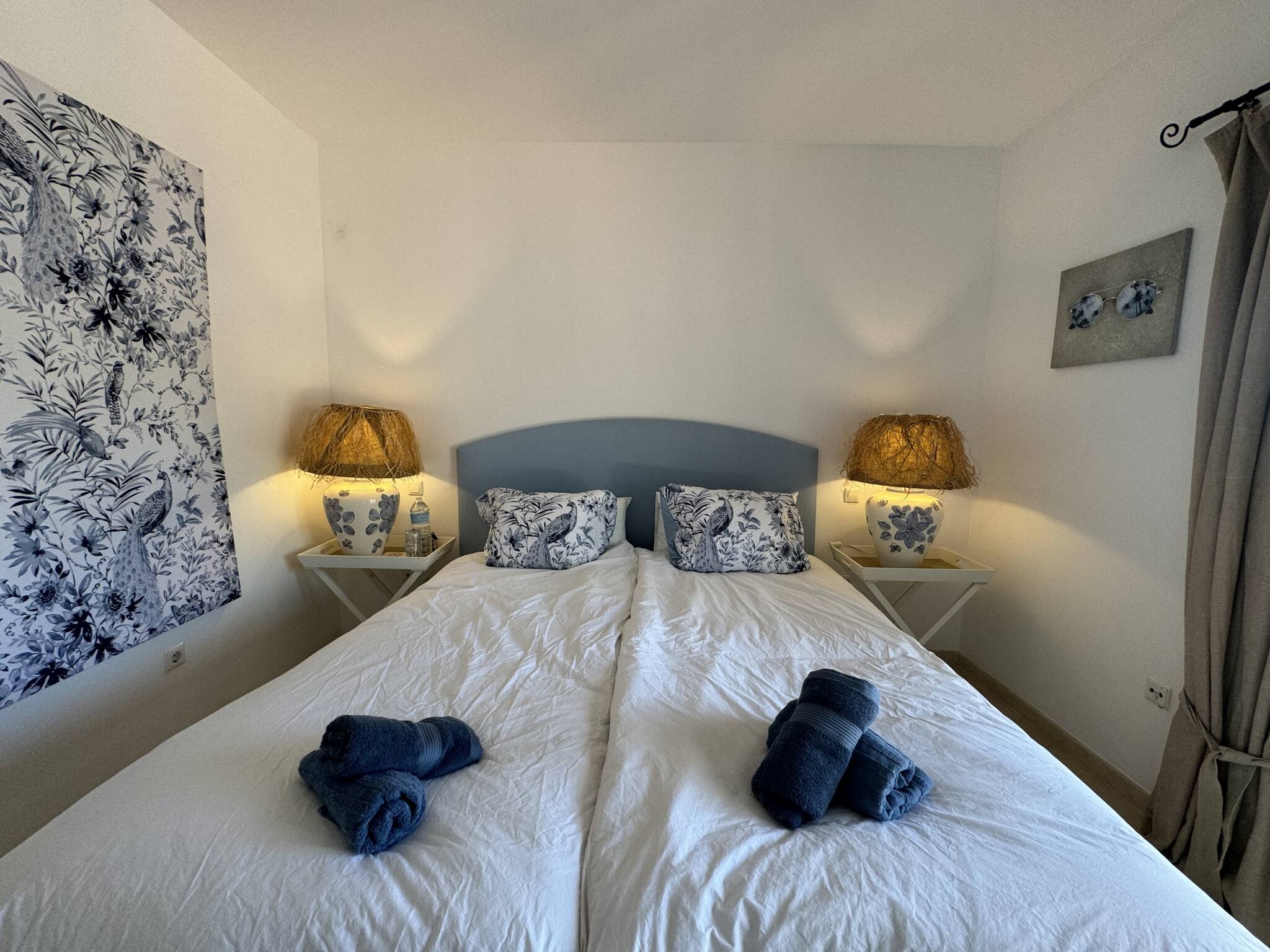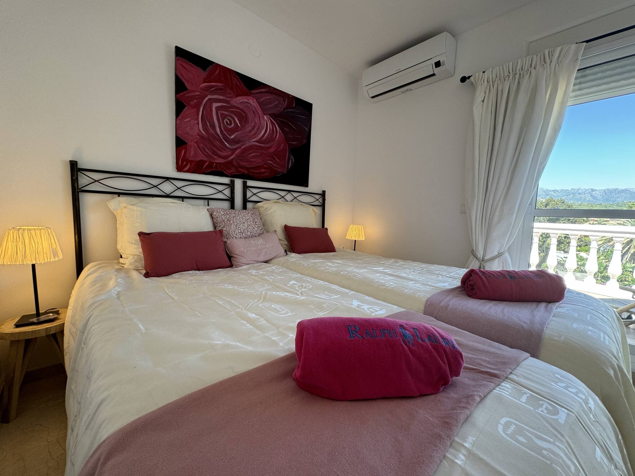 Im Erdgeschoss befinden sich zwei großzügige Schlafzimmer und im Obergeschoss vier weitere, alle geschmackvoll eingerichtet mit traumhaften Terrassen und atemberaubendem Meerblick. Eines der Schlafzimmer ist kleiner, mit einem Doppelbett, ideal für Kinder, die in der Nähe der Eltern schlafen möchten. Ein Badezimmer verfügt über eine Badewanne und Dusche, die übrigen drei über Duschen.