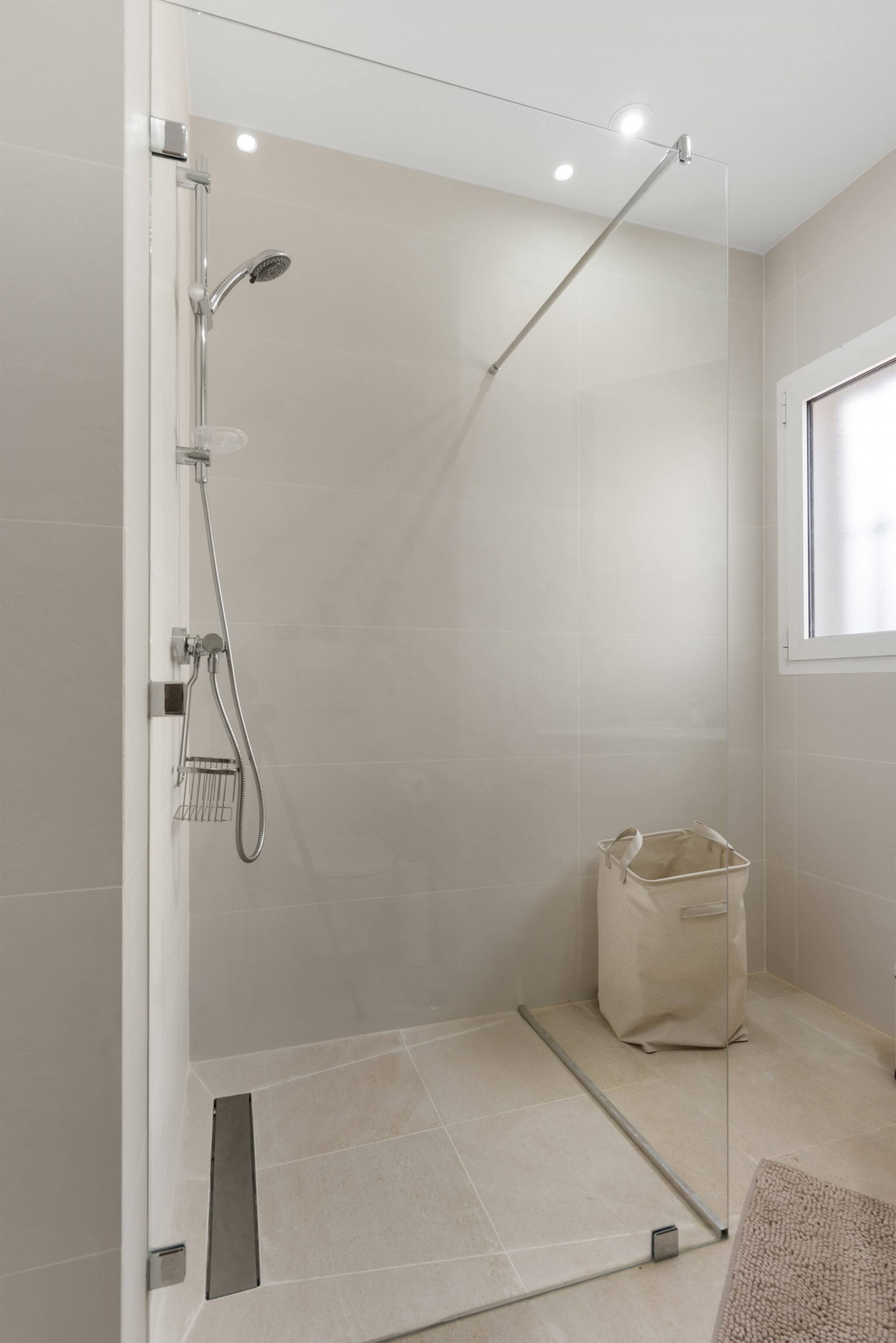 Beim Betreten der Villa befindet sich auf der rechten Seite der Garten mit einem großen Pool, perfekt für eine Abkühlung unter der Mittelmeersonne. Auf der linken Seite erwartet Sie ein Außenbad mit Dusche und Toilette – ideal nach einem Strandtag.