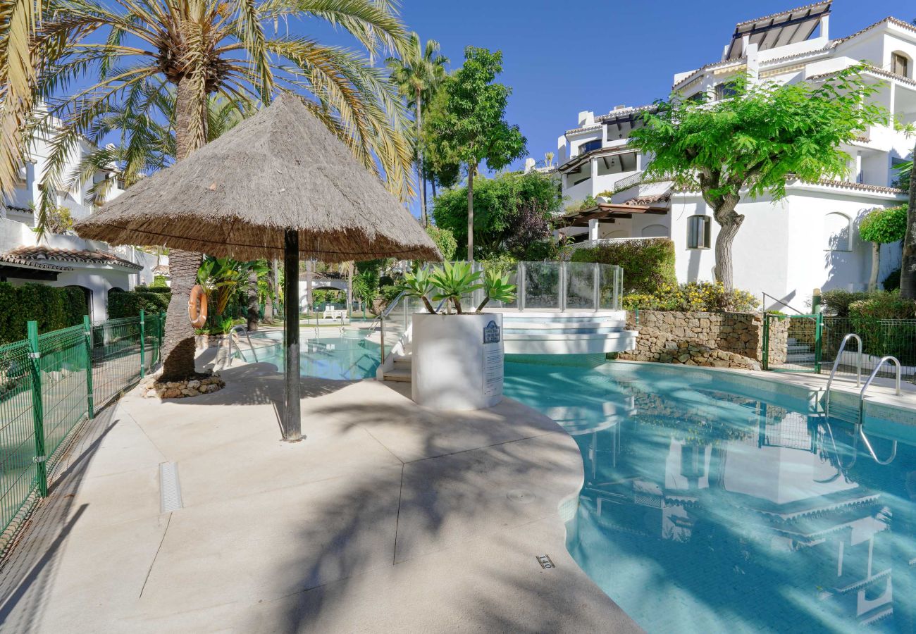 Bienvenido a nuestro apartamento en planta baja completamente renovado y moderno, ubicado a solo 150 metros de una de las playas más hermosas de Marbella, la famosa Golden Beach. Situado en la codiciada comunidad frente al mar de Elviria, esta propiedad ofrece jardines tropicales galardonados, tranquilos arroyos y fuentes, 2 grandes piscinas y 2 piscinas para niños. Estará a solo pasos de famosos restaurantes como La Scala y La Plage Casanis.