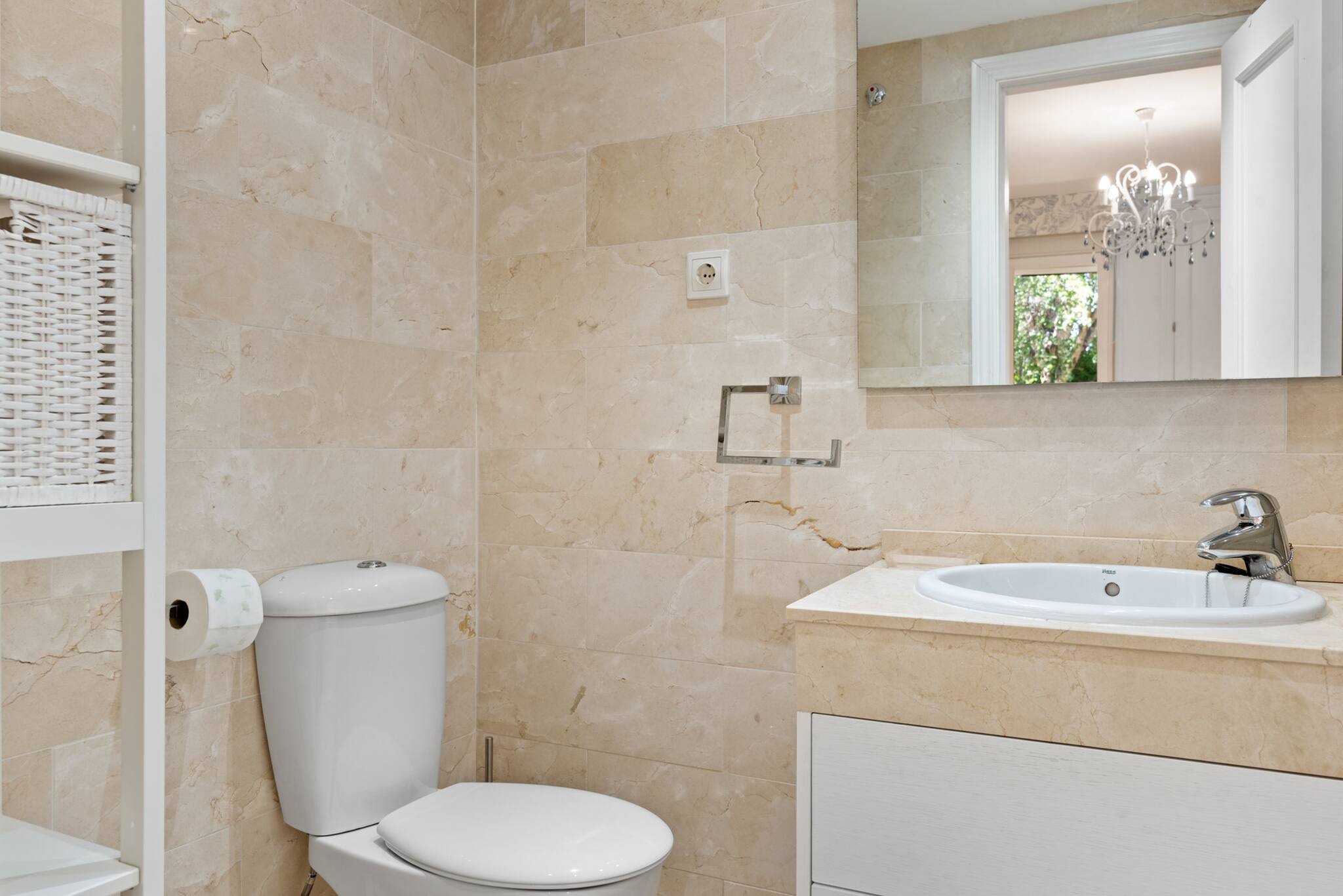 Bajando por la escalera desde la entrada, encontrará un aseo de invitados en el pasillo que da acceso a ambas habitaciones. Tanto la habitación principal con cama doble como la segunda habitación con 2 camas individuales, tienen acceso directo a otra terraza de aproximadamente 15 m2 con una pequeña mesa y 2 tumbonas. La habitación principal tiene un baño en suite con bañera, lavabo doble, inodoro y bidé. El otro baño tiene lavabo, inodoro y ducha.