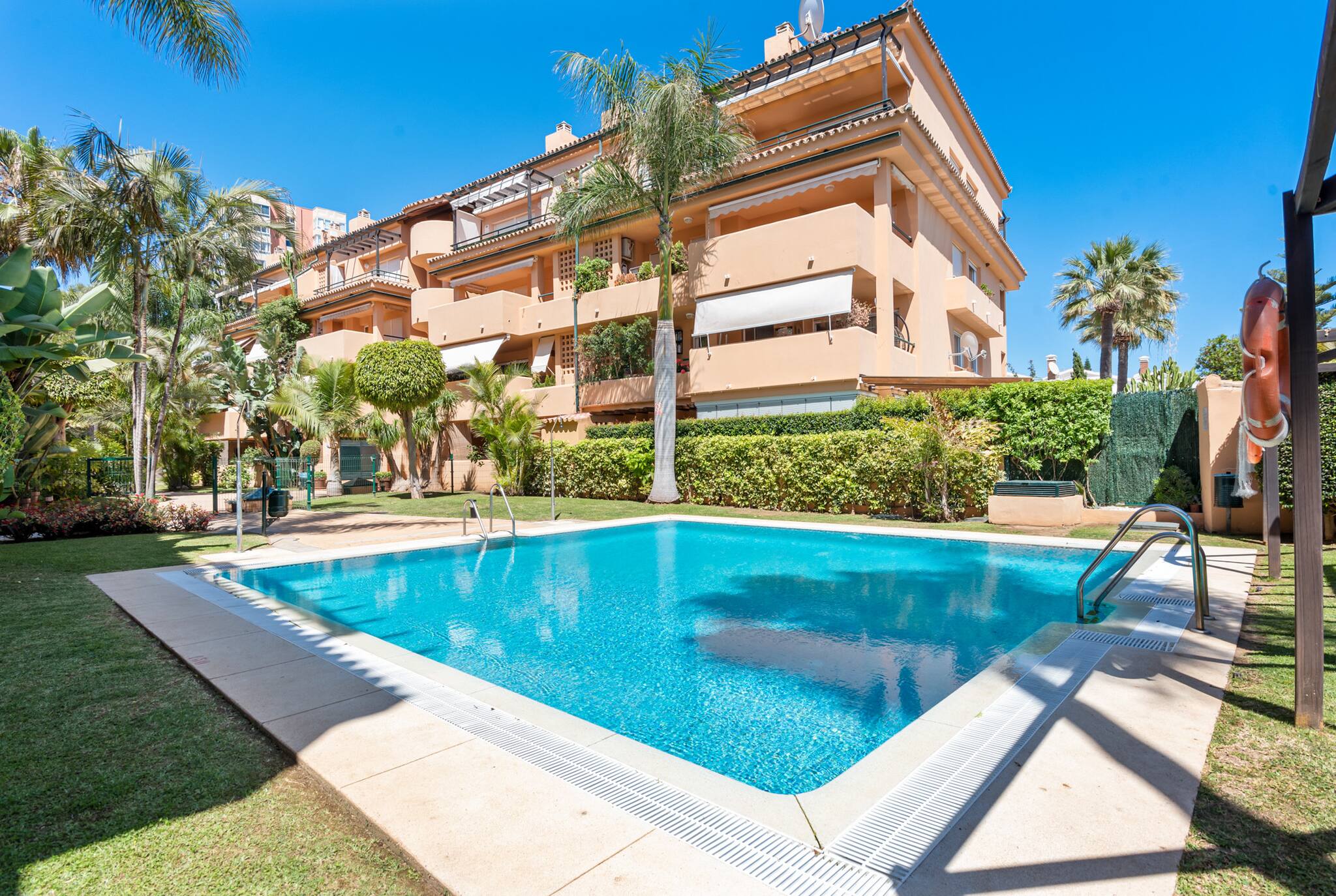 Residencial Playa Alicate está situado en segunda línea de playa en El Rosario, Marbella Este. El complejo está totalmente cerrado y cuenta con seguridad nocturna. La playa de arena es una de las mejores de la costa, con una suave pendiente que facilita el baño, ideal para que los más pequeños puedan jugar en el agua con seguridad.
