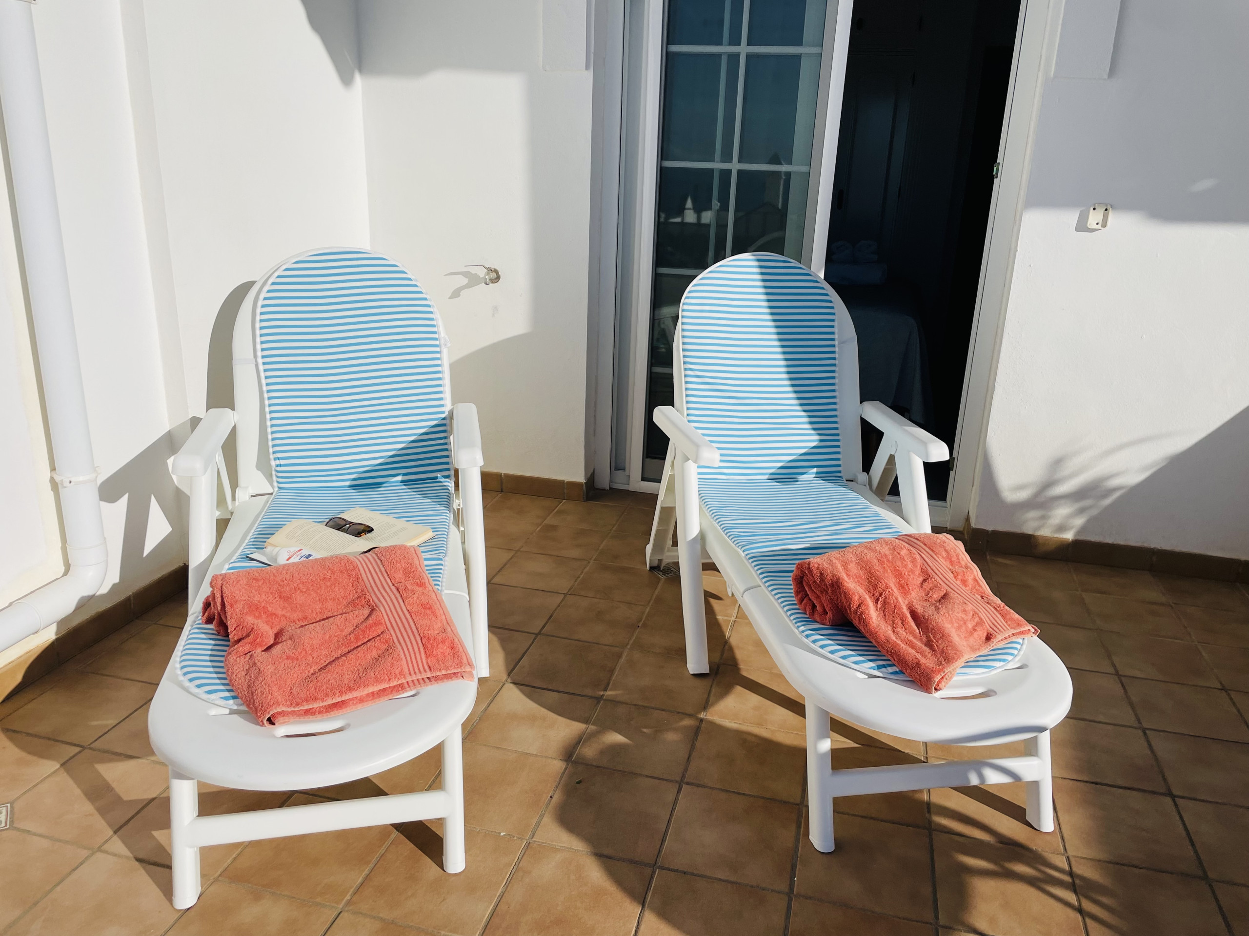 Lo que hace realmente especial a este apartamento es su terraza con vistas directas al mar. Disfruta de una zona de sofás para relajarte y otra con tumbonas para tomar el sol y disfrutar del clima mediterráneo.