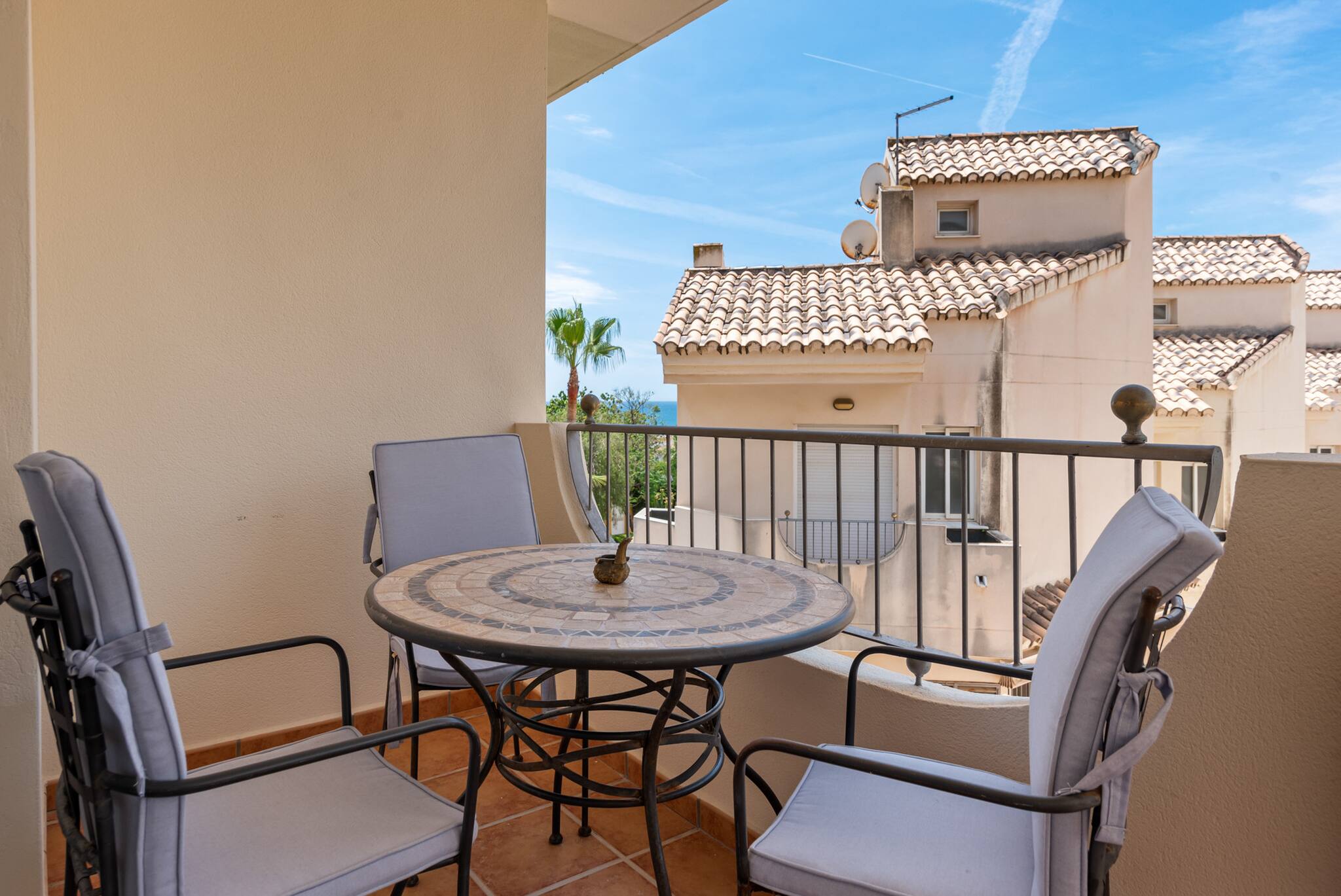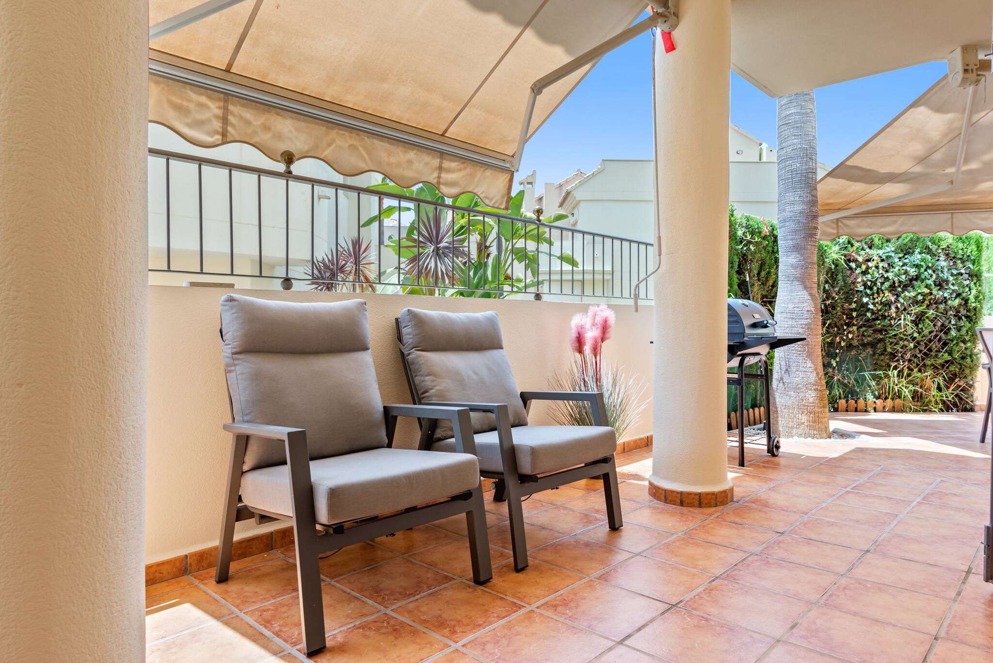 En el exterior, una gran terraza envolvente te invita a tomar el sol, disfrutar de una barbacoa y comer al aire libre. En la planta superior, dos terrazas más pequeñas ofrecen vistas parciales al mar. La piscina y el jardín comunitarios, rodeados de palmeras, proporcionan un entorno pintoresco para relajarte.