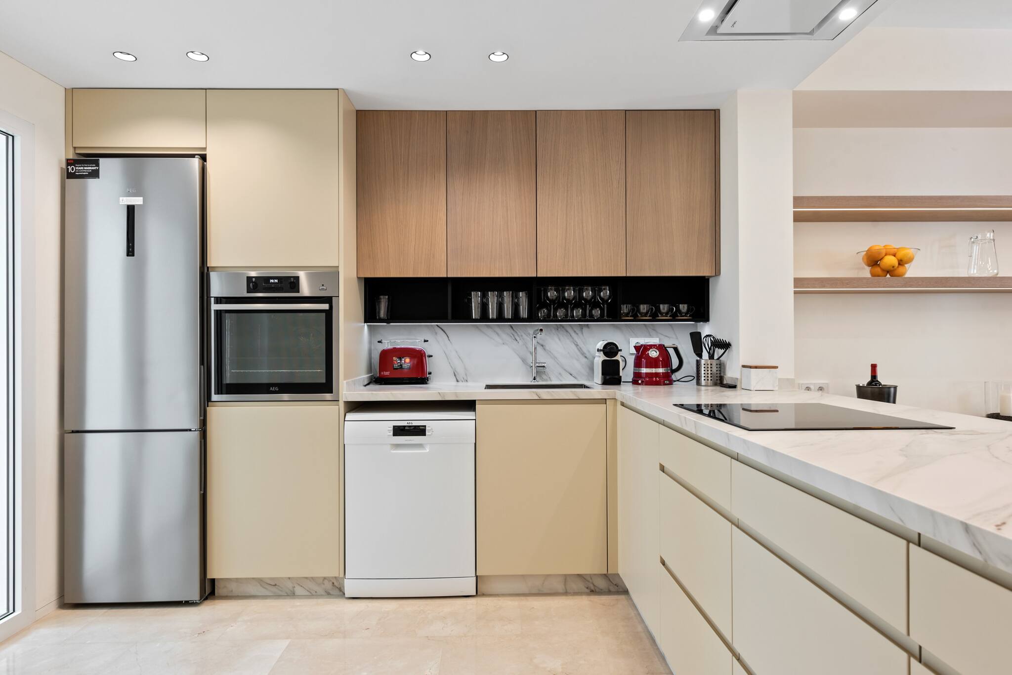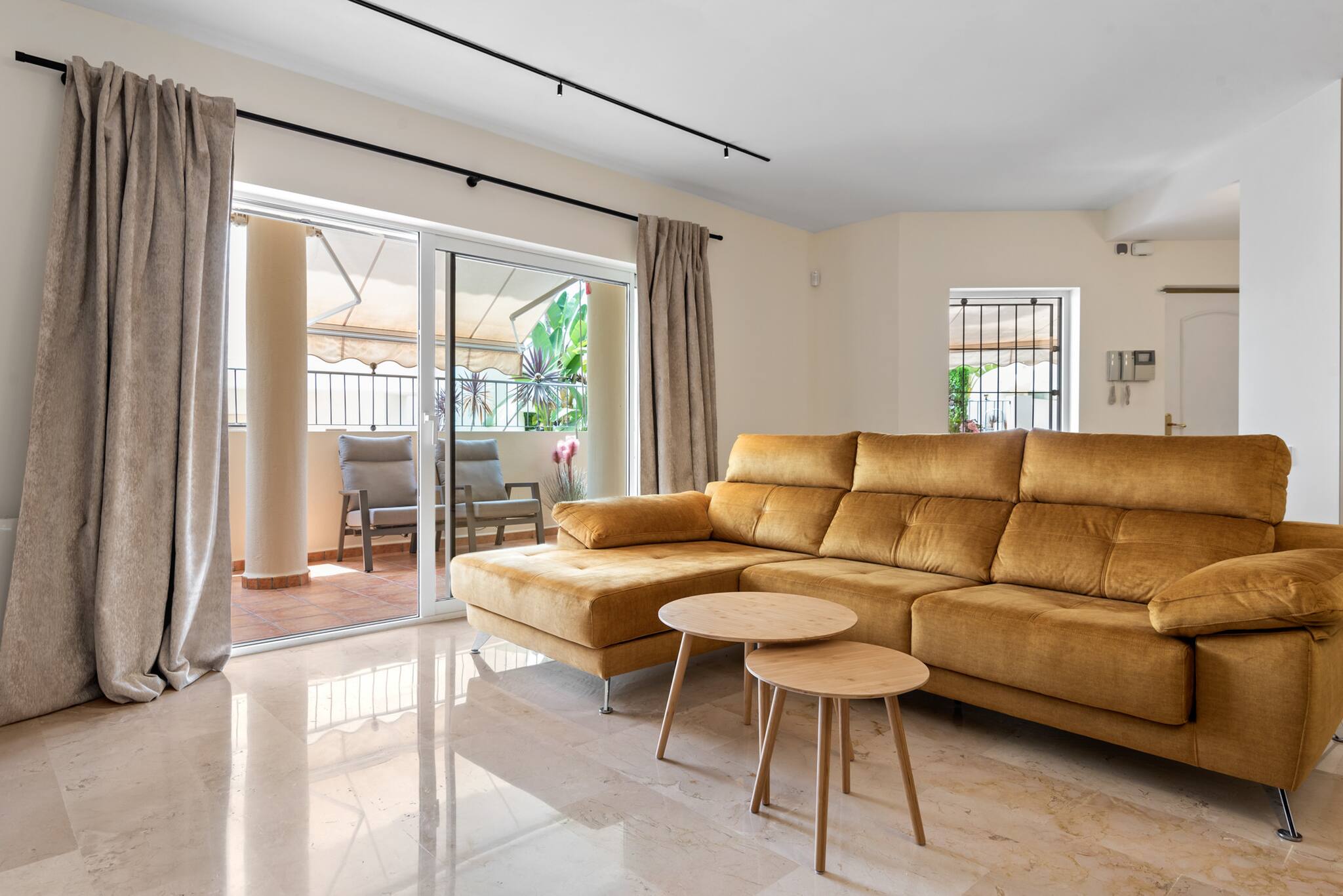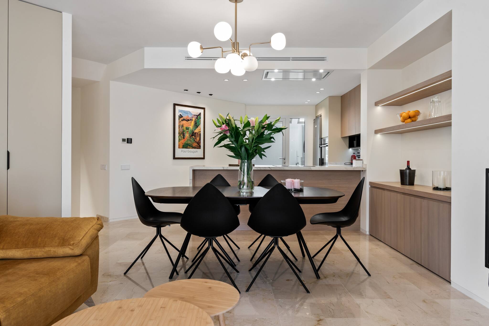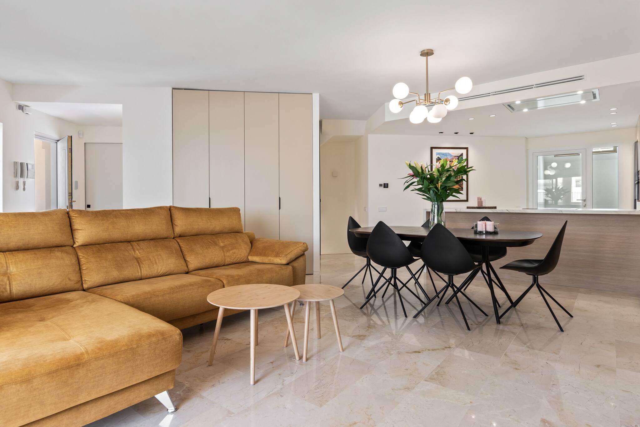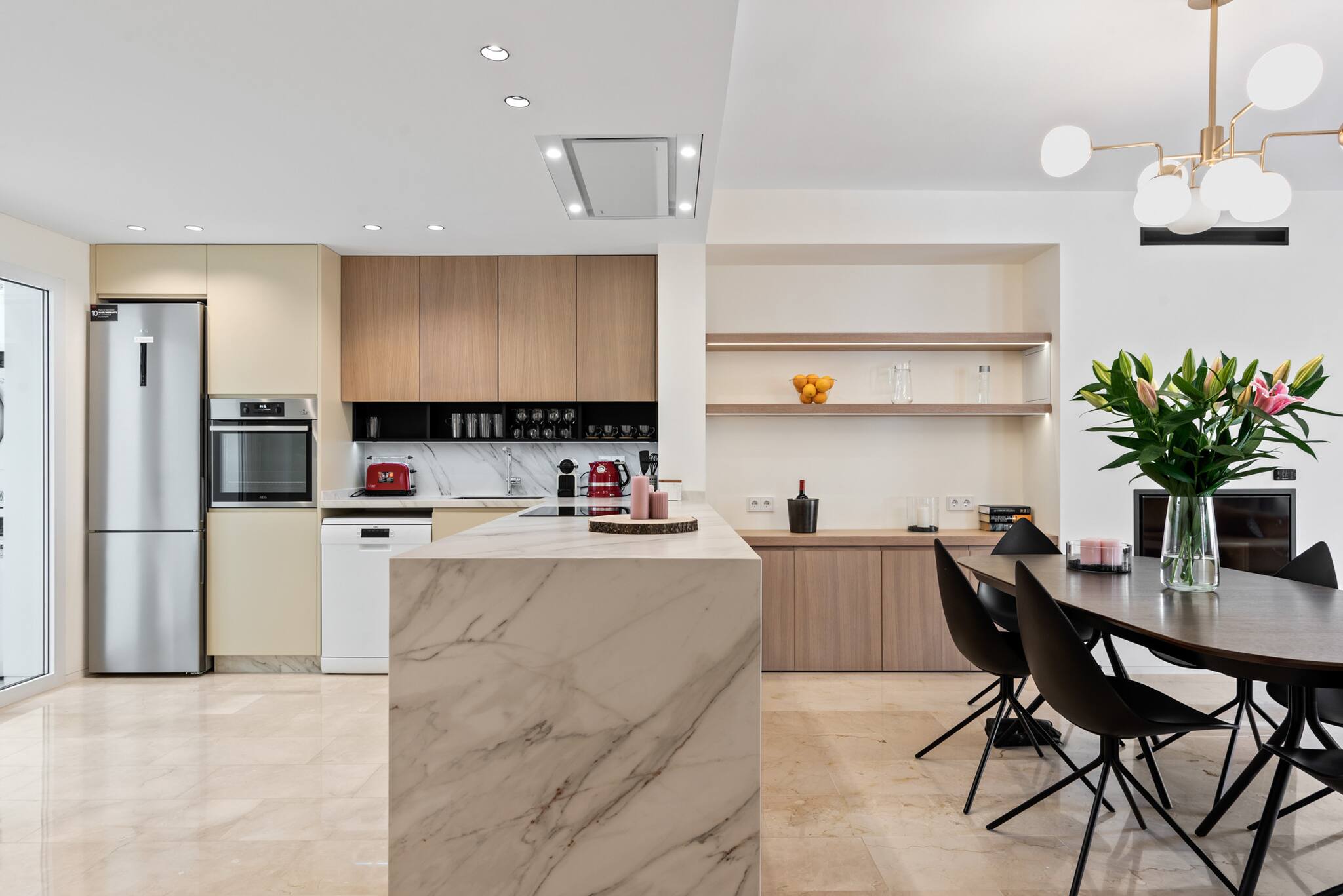Al entrar, te recibe un diseño de planta abierta que integra la cocina, el comedor y el salón. El diseño moderno y la abundante luz natural crean un ambiente luminoso y acogedor en toda la propiedad. Para mayor comodidad, hay un lavadero equipado con lavadora/secadora y un frigorífico/congelador adicional.