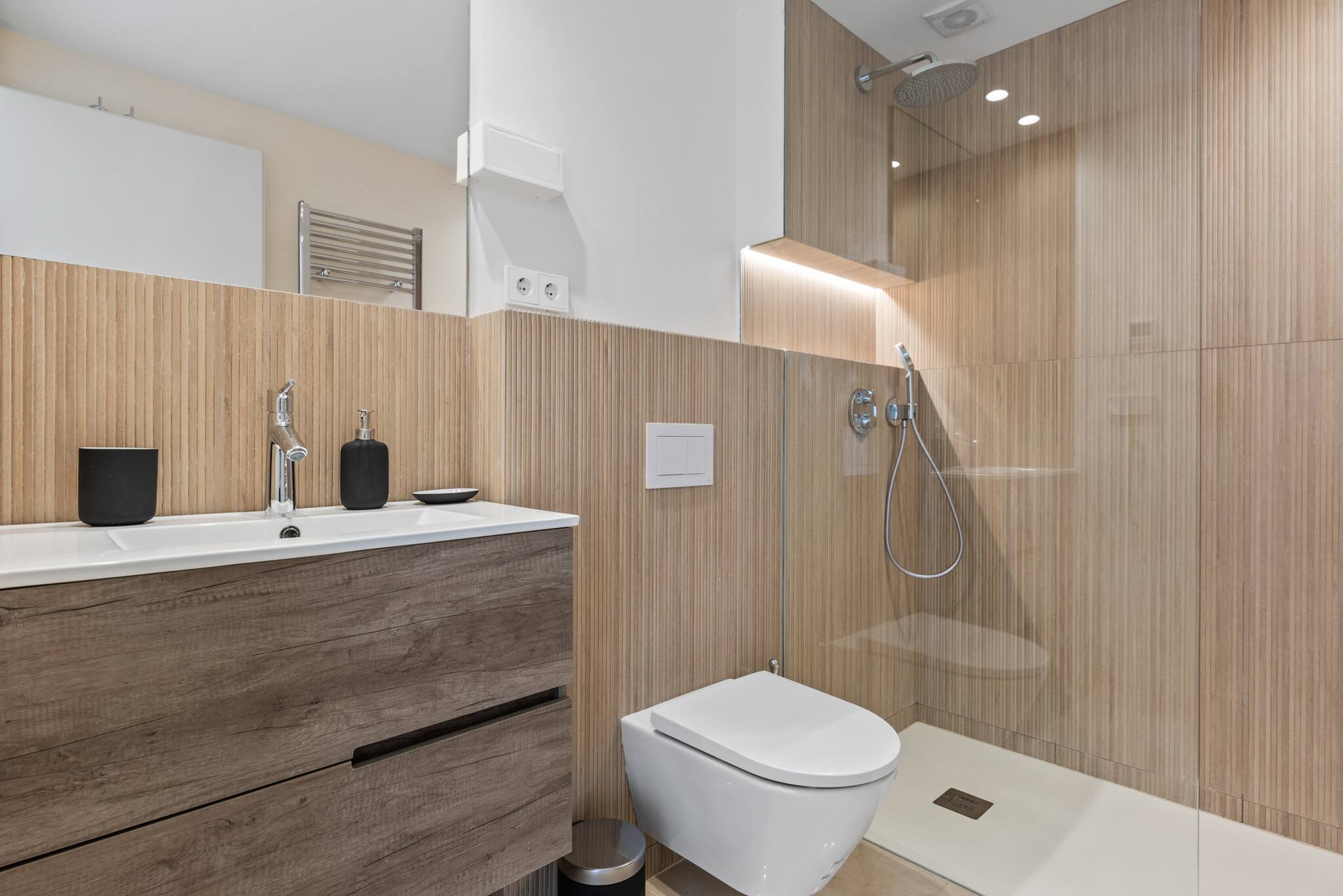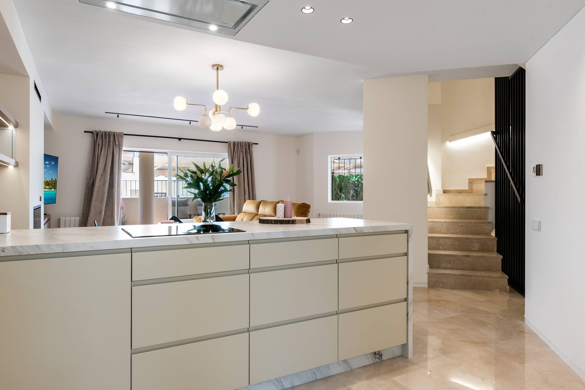 La villa, de reciente construcción y decorada con mucho gusto, cuenta con una cocina y salón de concepto abierto en la planta baja, con acceso directo a una piscina privada de agua salada climatizada y un jardín cuidadosamente ajardinado. También hay un dormitorio con baño independiente y un aseo para invitados en esta planta.
