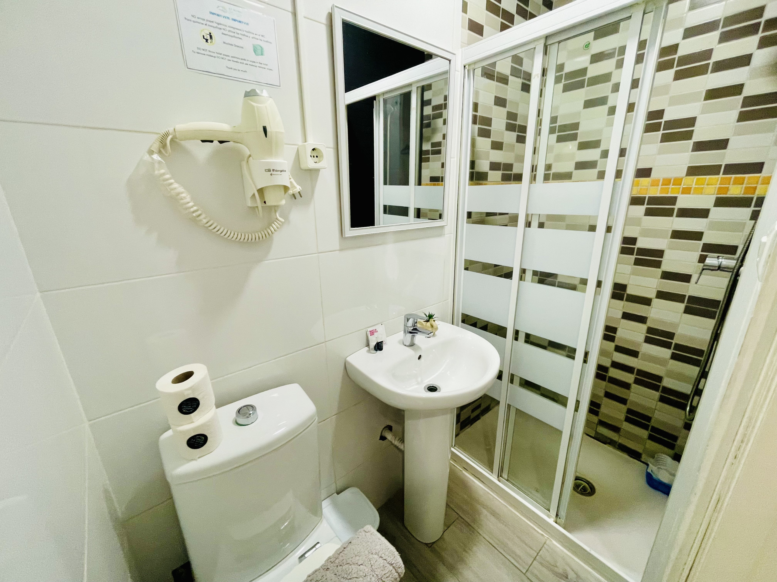 El baño, equipado con un moderno plato de ducha, ofrece todas las comodidades necesarias para empezar el día con energía. Además, podrás disfrutar de momentos de entretenimiento con la televisión, y encontrarás una lavadora para tu conveniencia durante tu estancia.