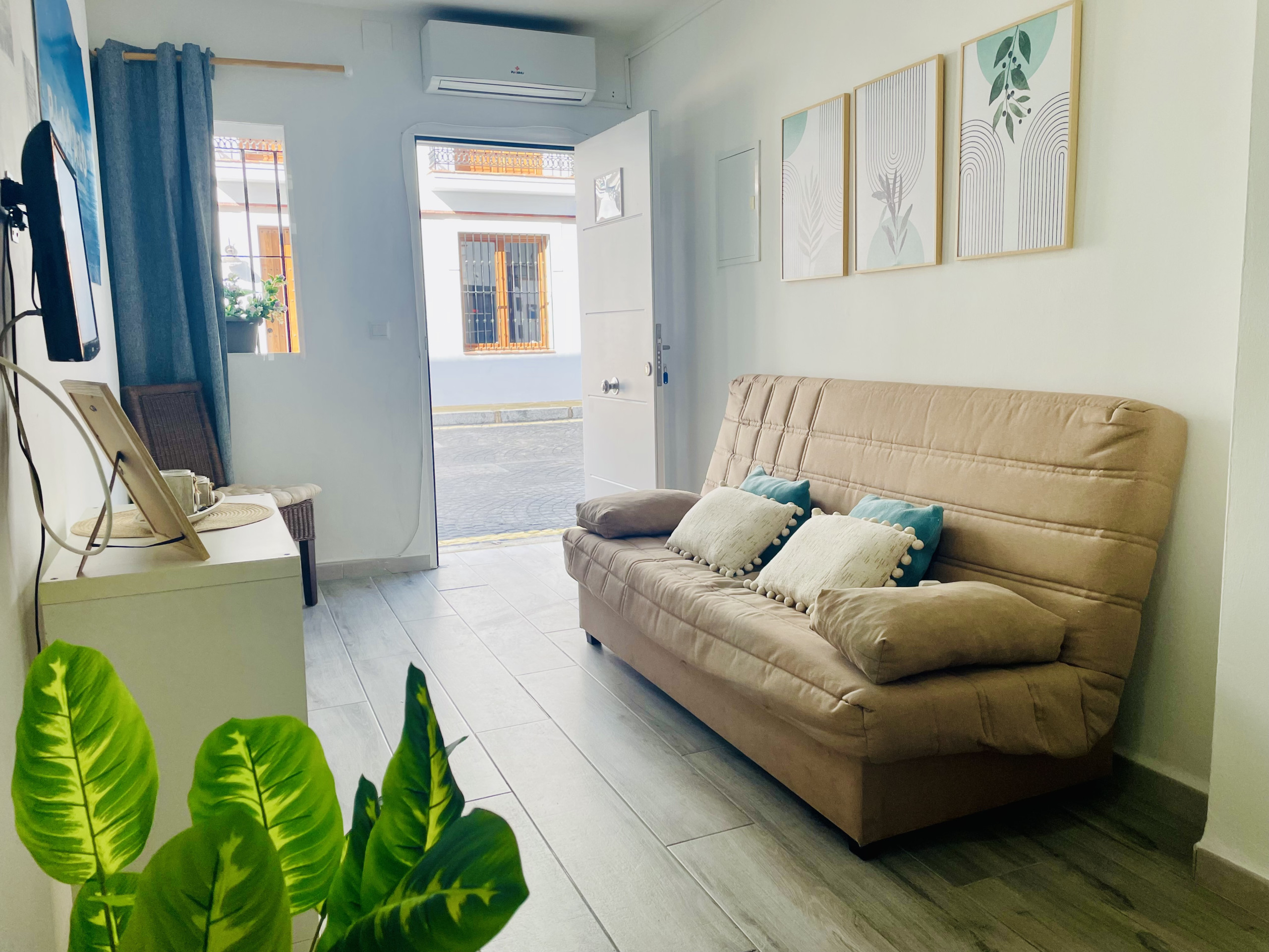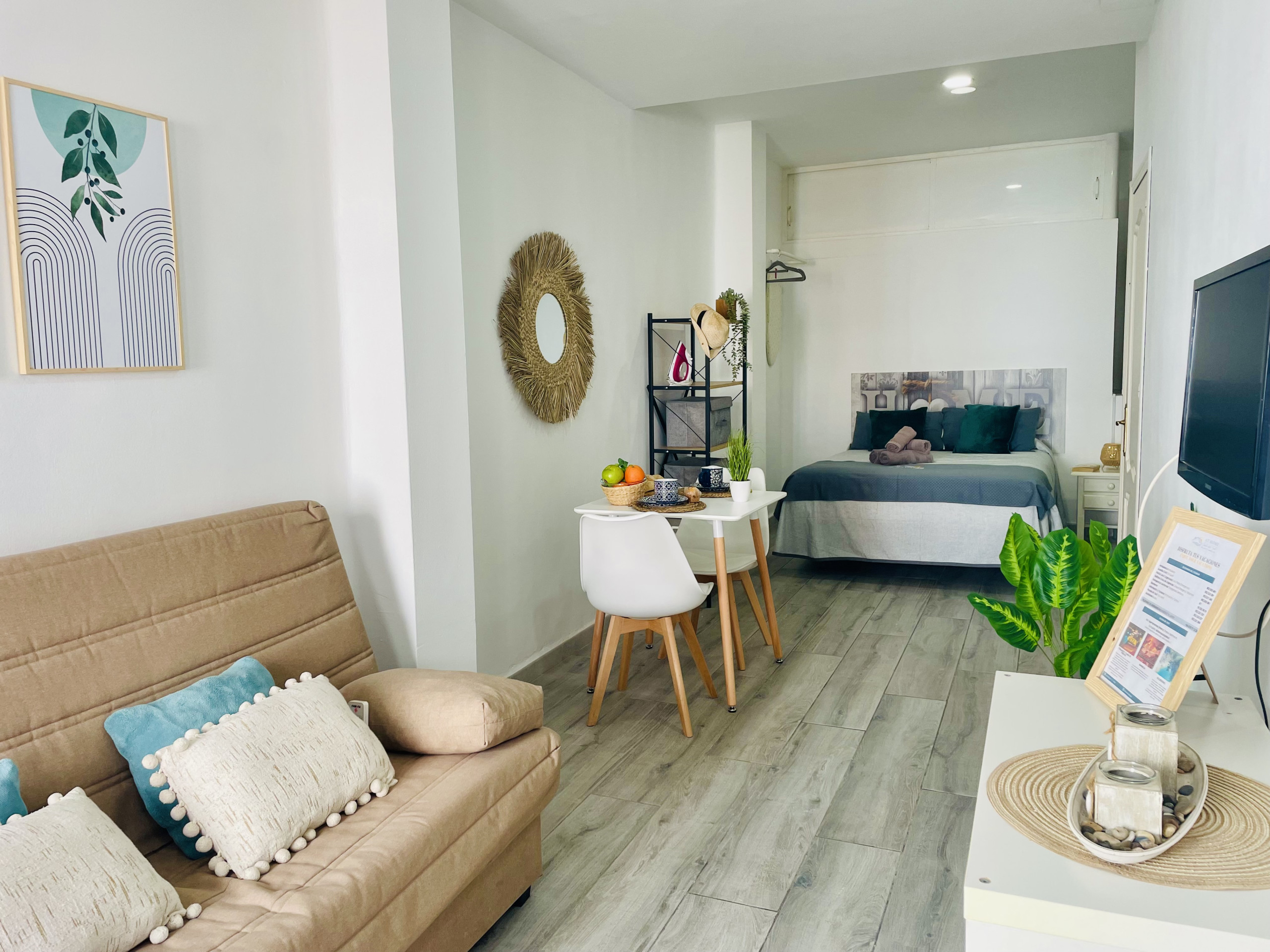 Piso Estudio Burriana en pleno centro de Nerja. Con una cama doble y un sofá cama, es perfecto para 2 adultos y un niño o 3 adultos.