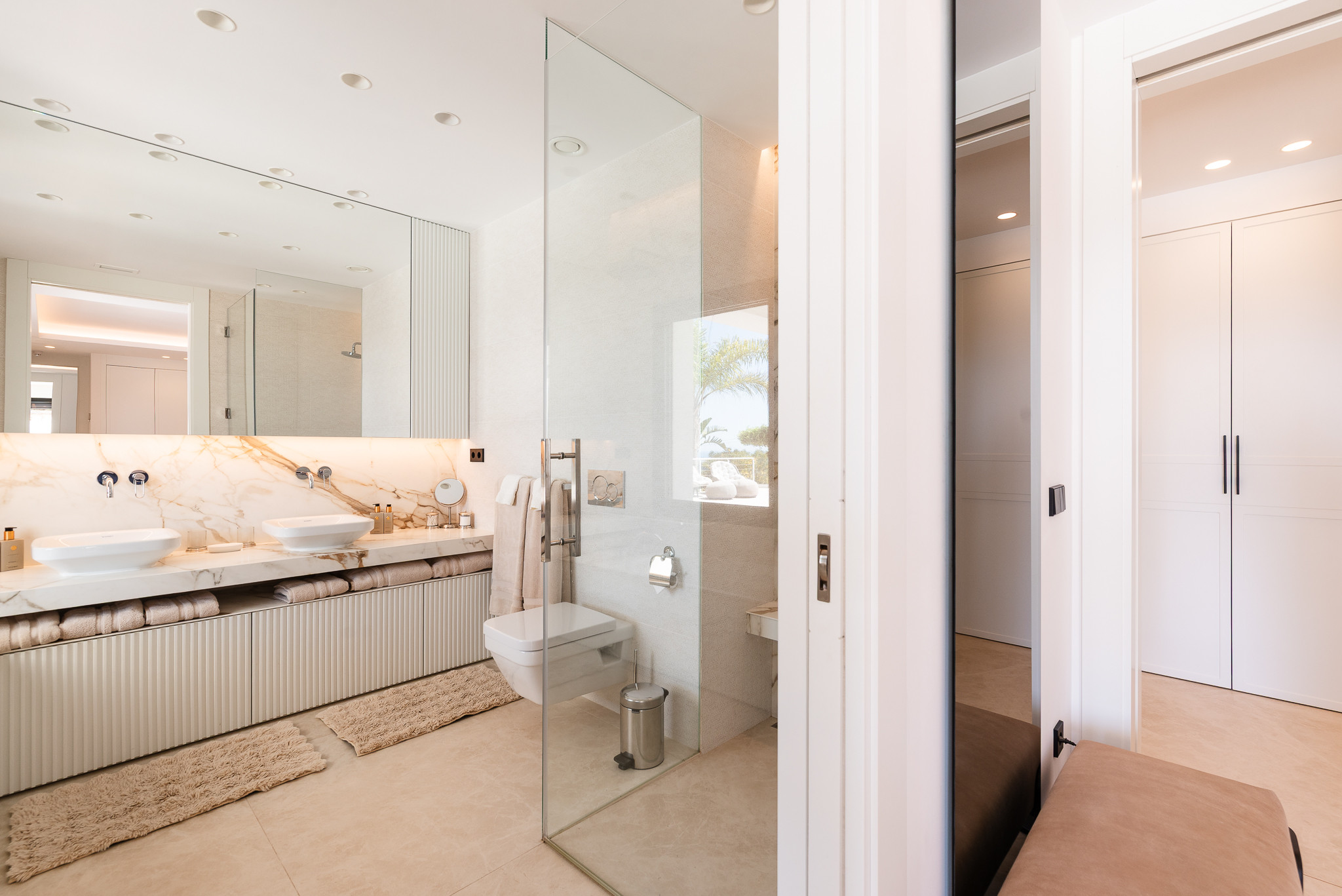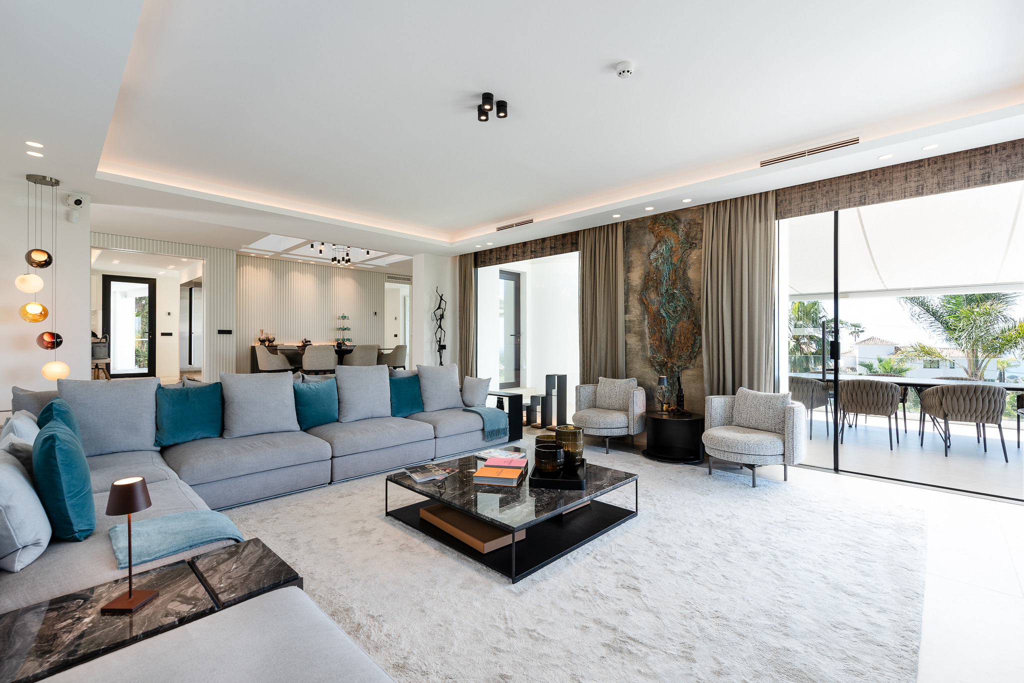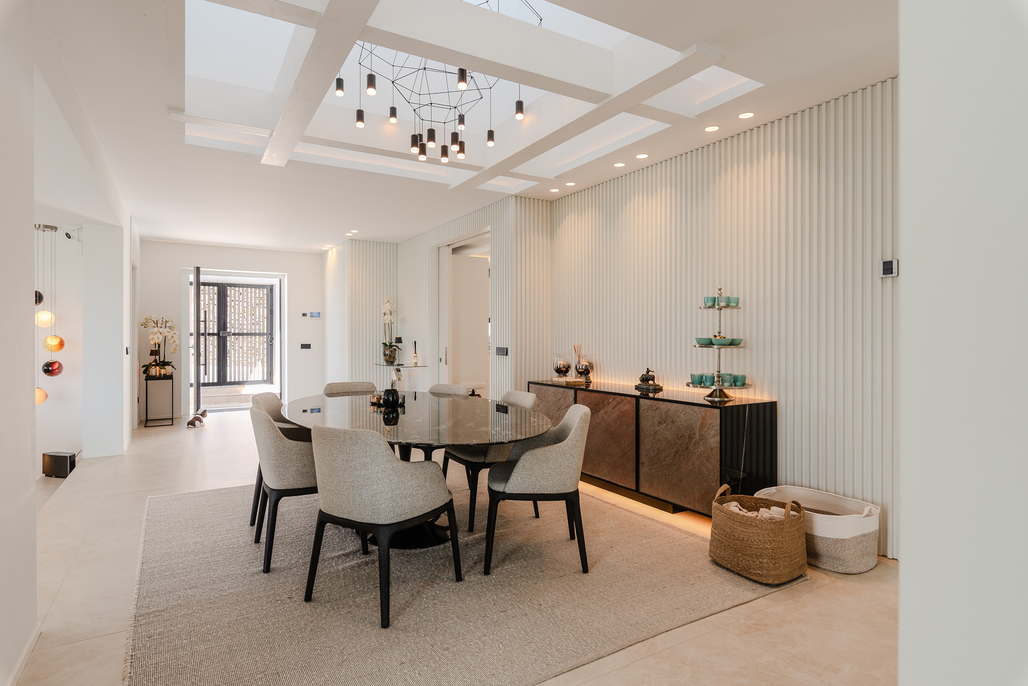 Desde el primer momento en que entras en Villa Riva, te envuelve una sensación de lujo y confort. Dispone de suelo radiante para los meses más fríos y aire acondicionado en todas las habitaciones. El salón y la cocina comparten un espacio diáfano con grandes ventanales y puertas correderas que permiten la entrada de abundante luz natural.
