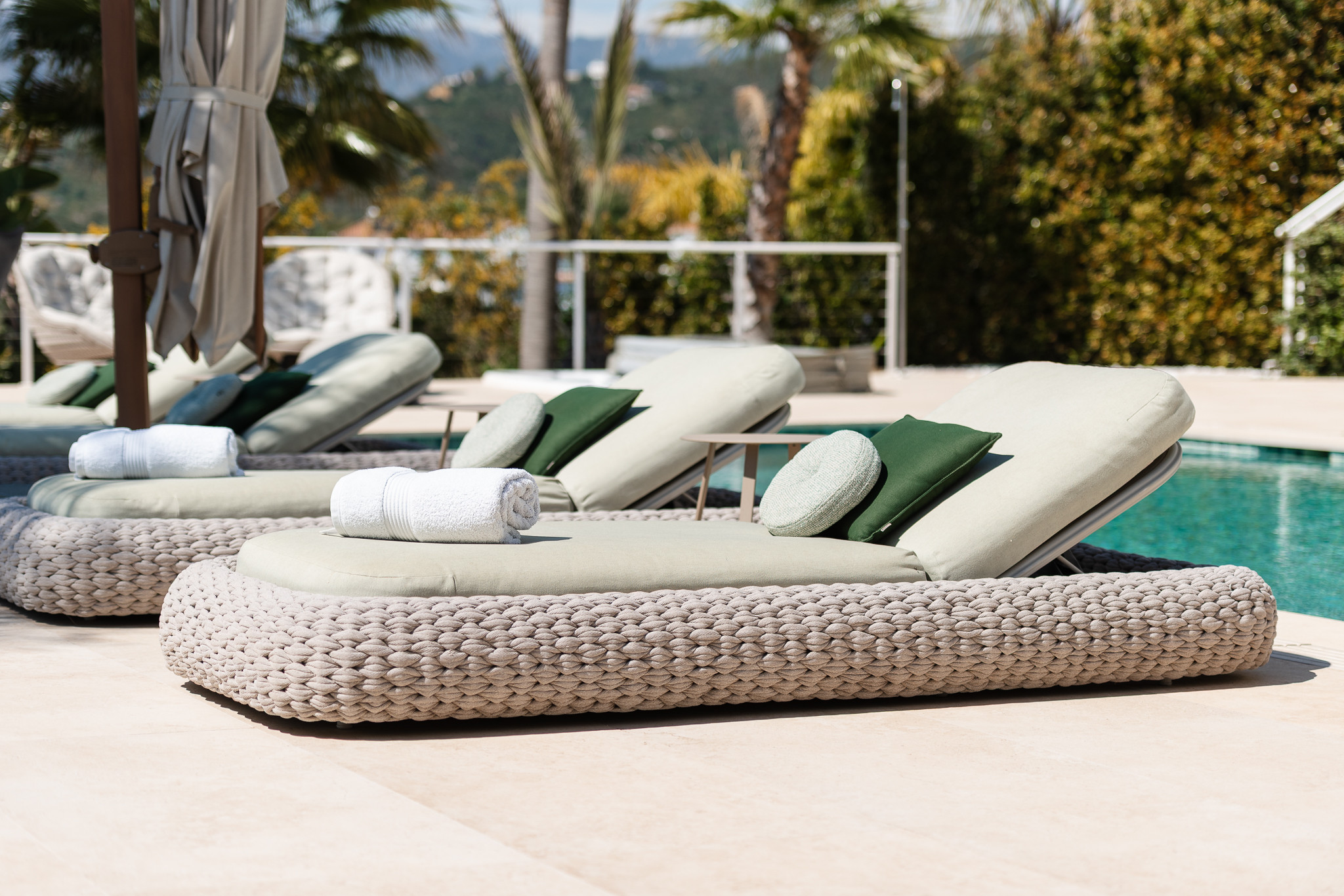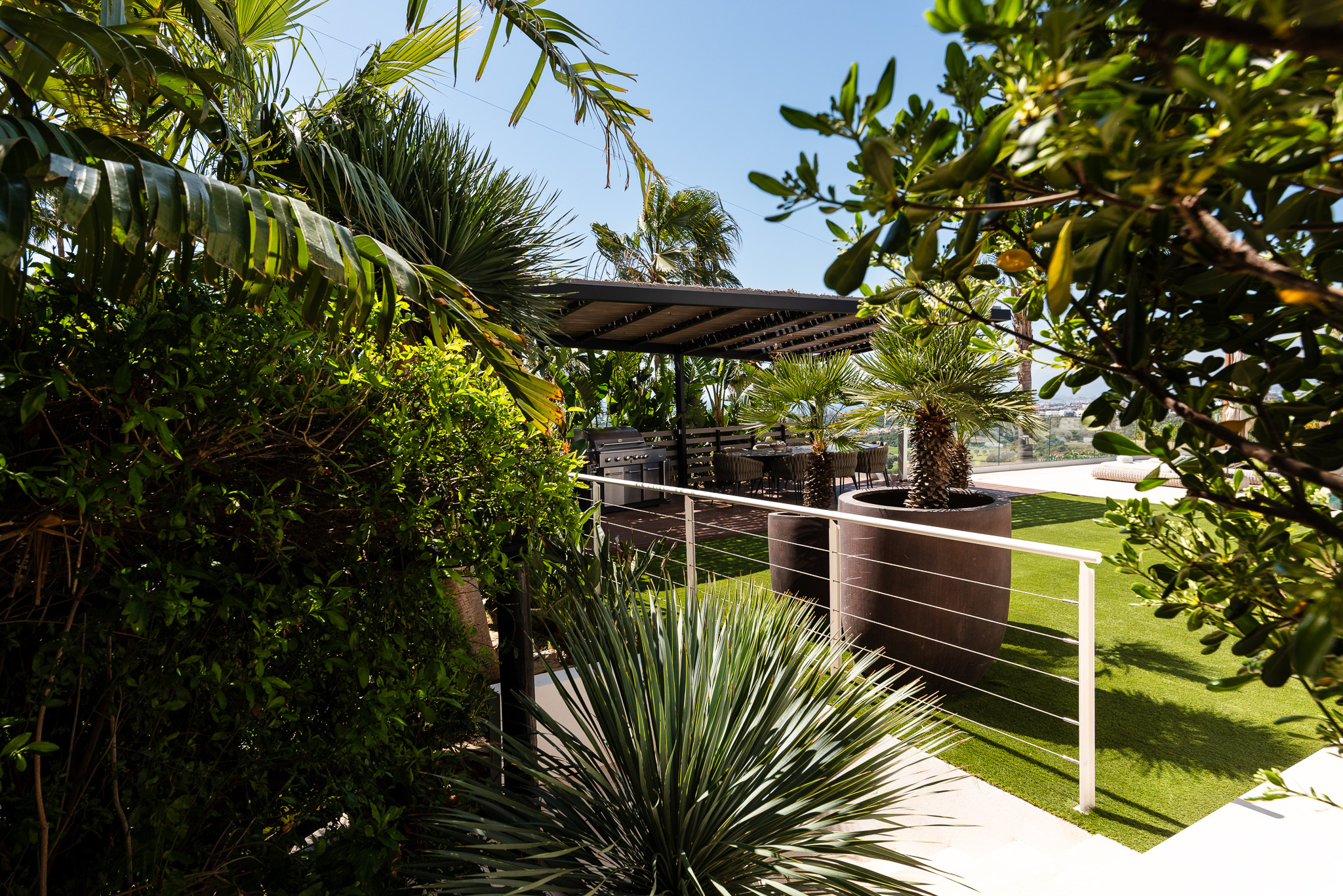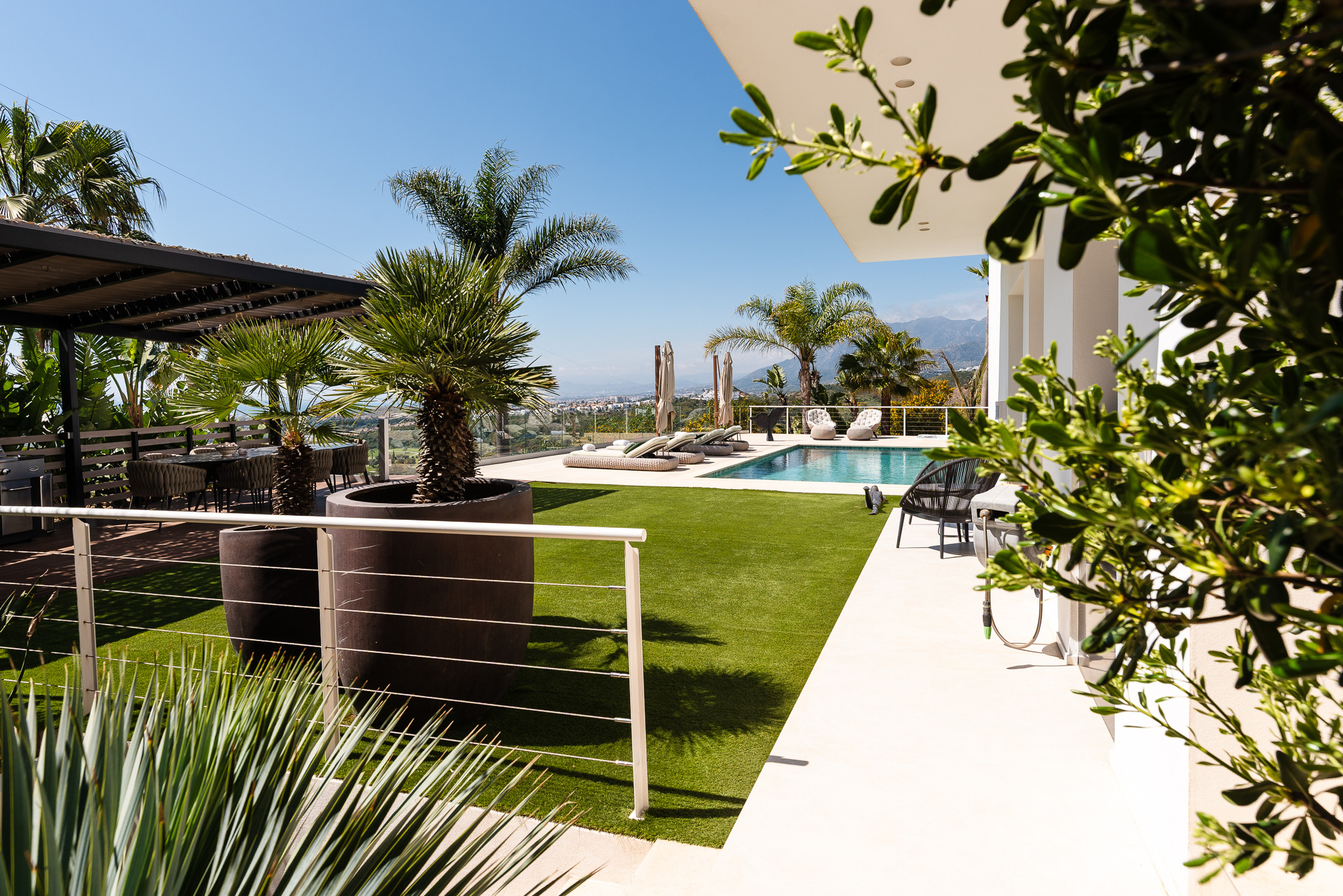 Desde este área de jardín y piscina tendría que ir más allá y bajar hasta un campo de fútbol pequeño para que los niños puedan jugar alrededor. Toda esta zona es un área cerrada.