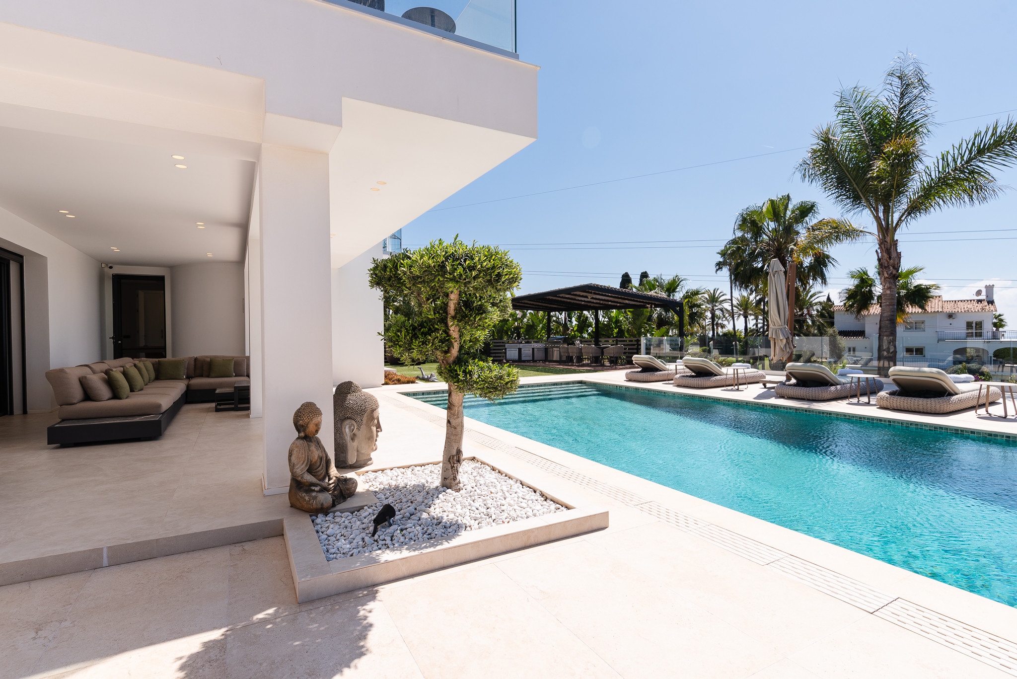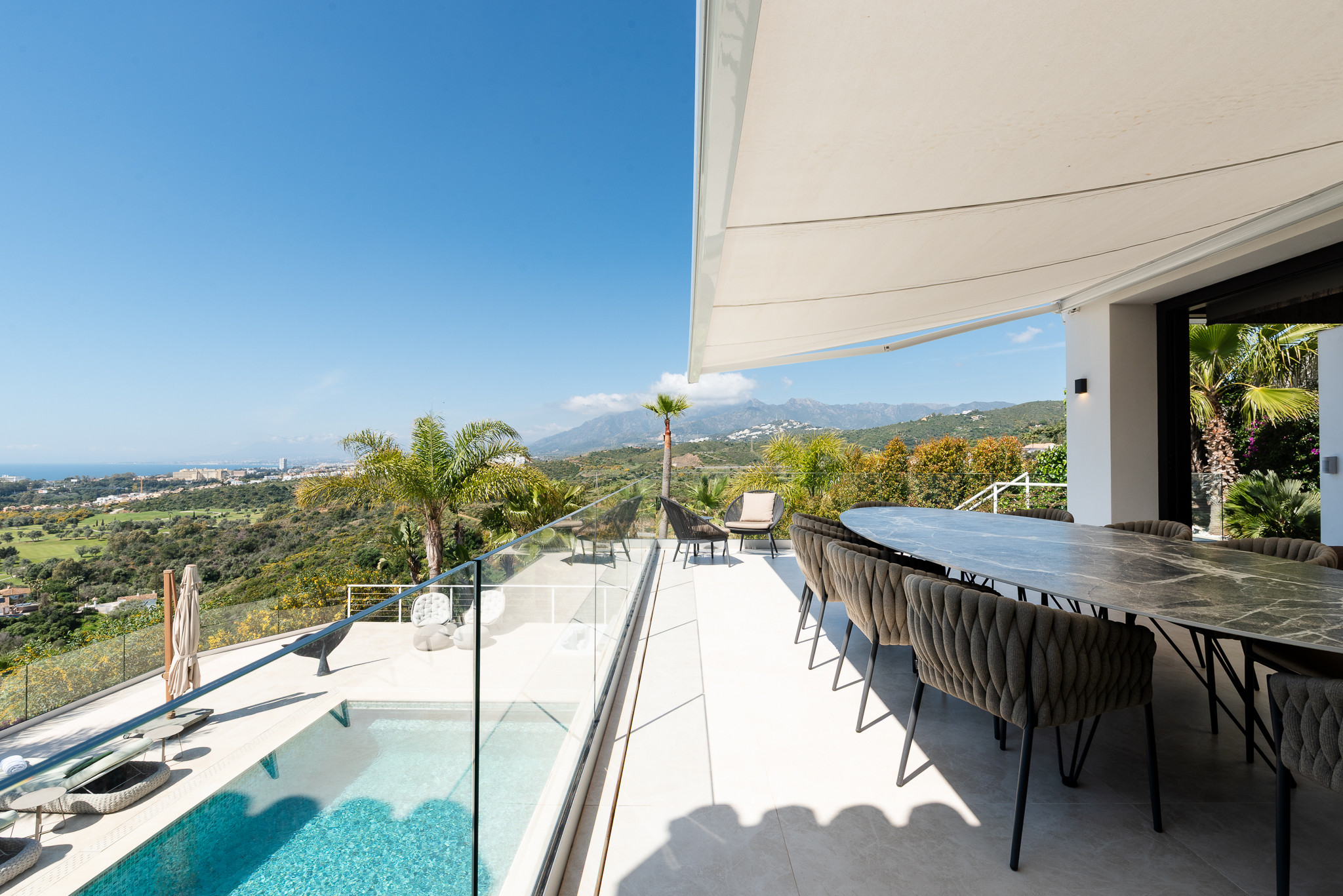 Puedes llegar al centro de Marbella en 10 minutos, al aeropuerto de Málaga en 30 minutos y a Puerto Banús en 15 minutos. Cerca encontrarás muchas playas de arena fina, así como clubes de playa muy conocidos como Los Monteros La Cabane, Nosso, Luuma y Trocadero Arena. El Royal Tennis Club Marbella también está a solo 5 minutos en coche (tenis, pádel y gimnasio).