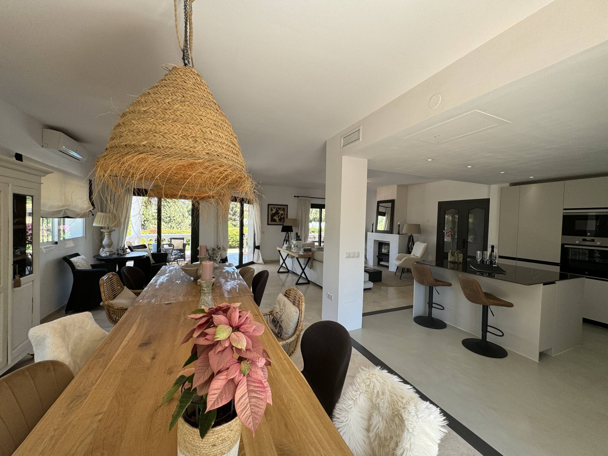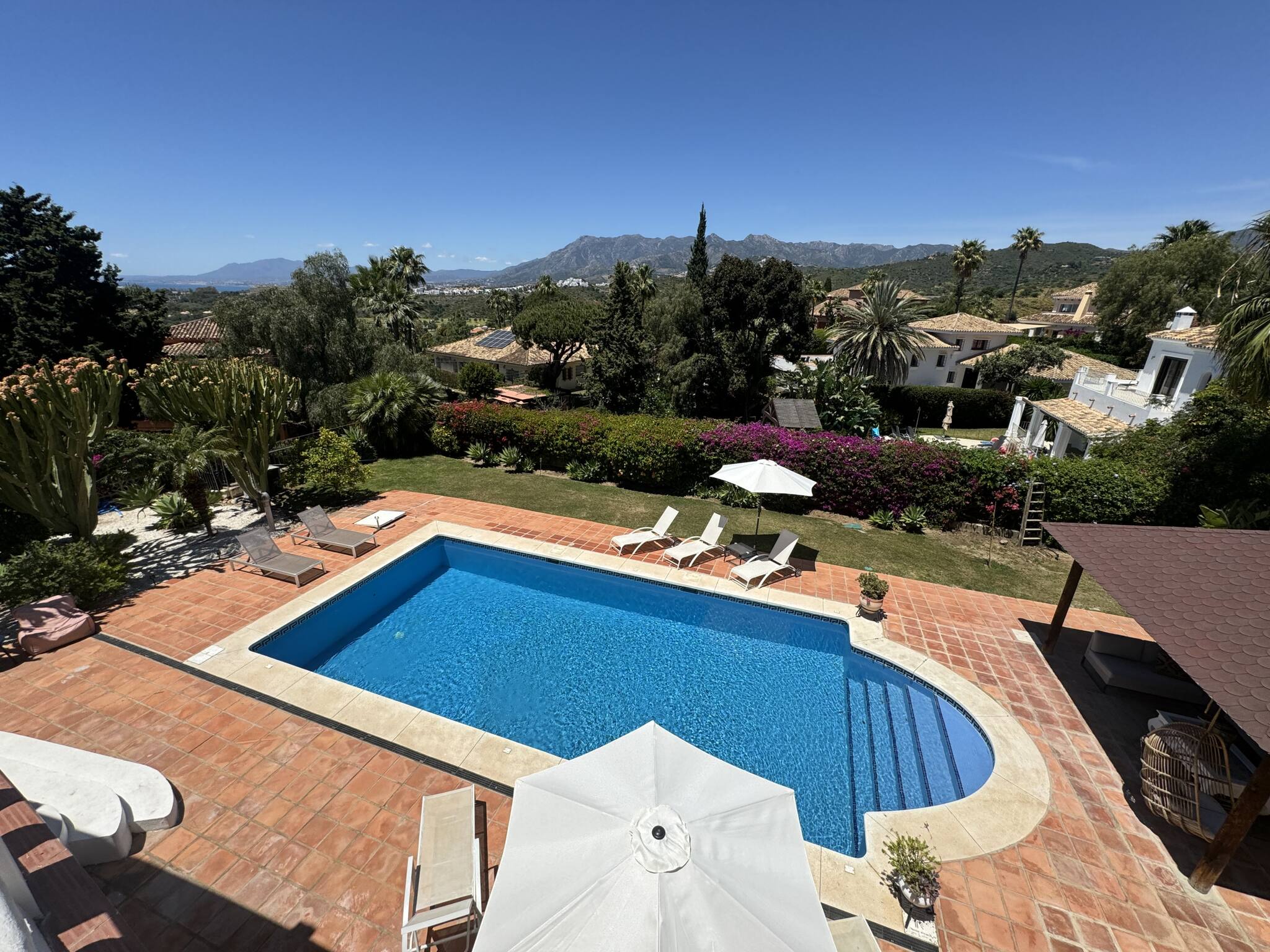 Cuenta con un amplio y luminoso salón-comedor con chimenea y una cocina abierta totalmente equipada, con una gran terraza cubierta desde la que se accede directamente a la piscina y al jardín. La terraza dispone de zona de barbacoa y comedor exterior desde donde se pueden disfrutar de maravillosas vistas a la bahía de Marbella. Tiene cinco bonitos dormitorios en suite, cinco baños y un aseo de invitados. Además, esta villa cuenta con un apartamento en el sótano pero con luz natural, entrada independiente, totalmente equipado con cocina, baño, salón y un dormitorio. La propiedad también dispone de gimnasio y sauna. Garaje cubierto privado para dos coches. Tiene varias terrazas cubiertas y descubiertas, así como una zona de porche con jardín. Es una propiedad que transmite tranquilidad y armonía.
