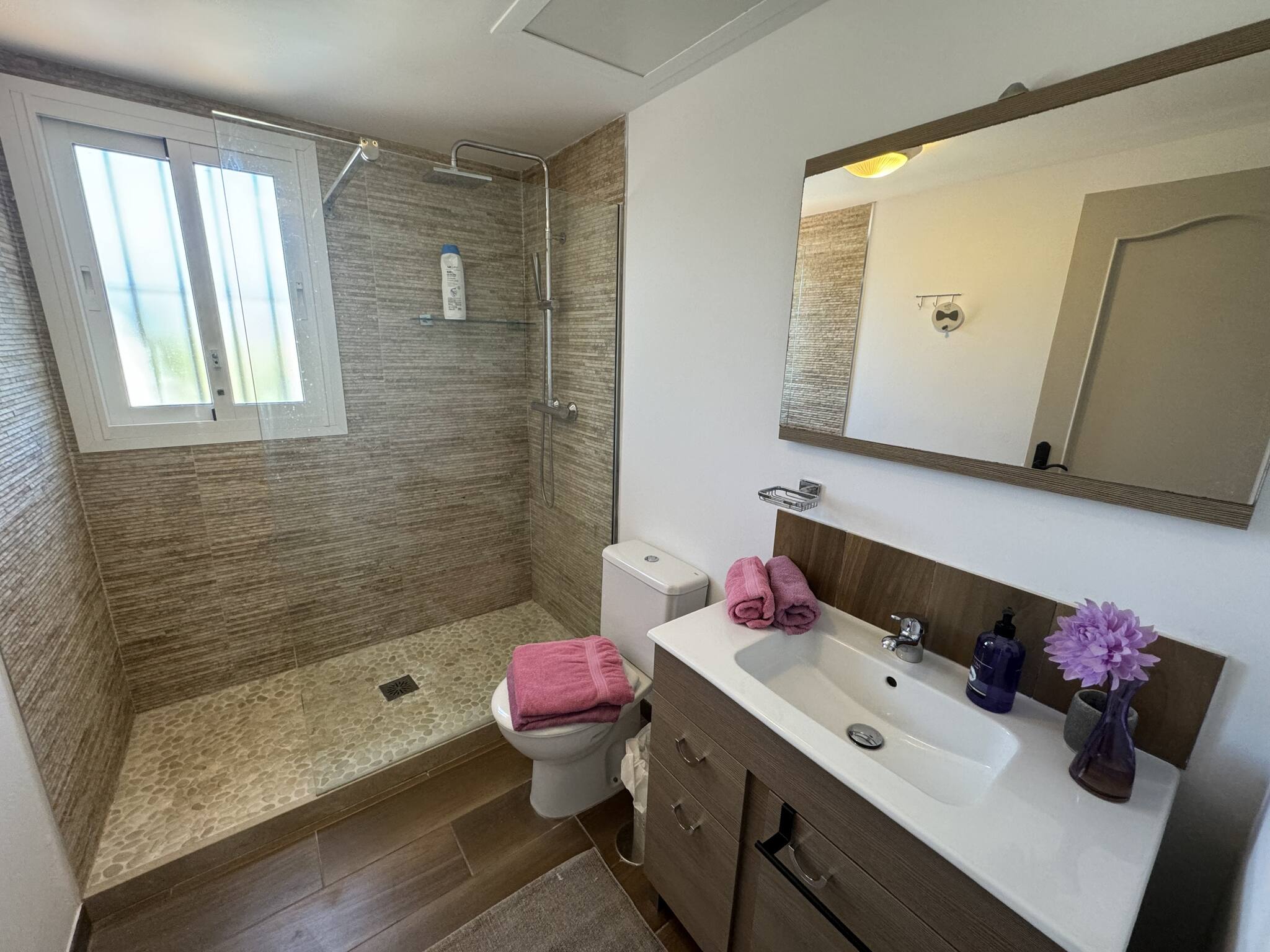 La planta baja tiene 2 dormitorios con camas dobles y baños en suite con ducha, inodoro y lavabo.