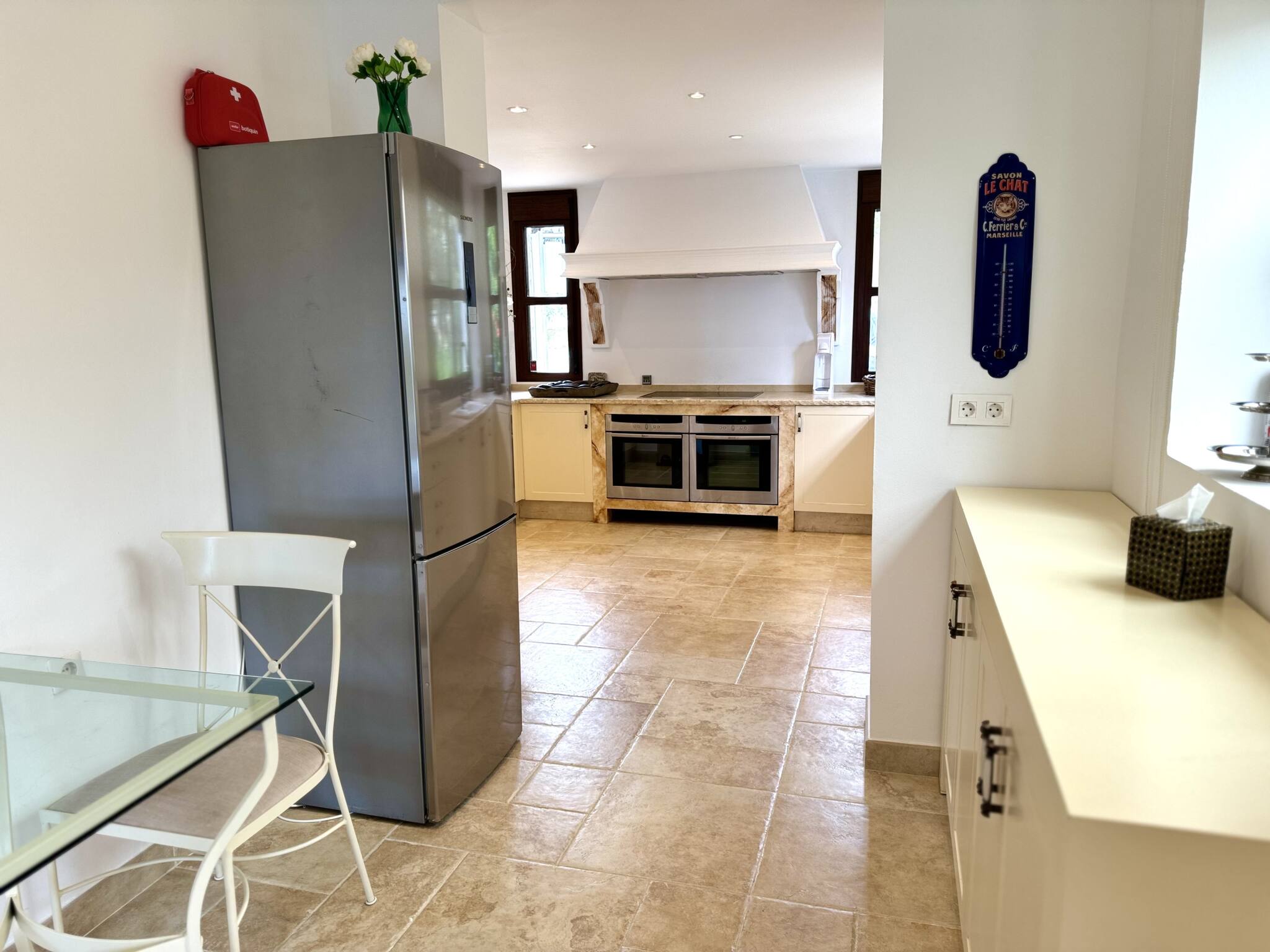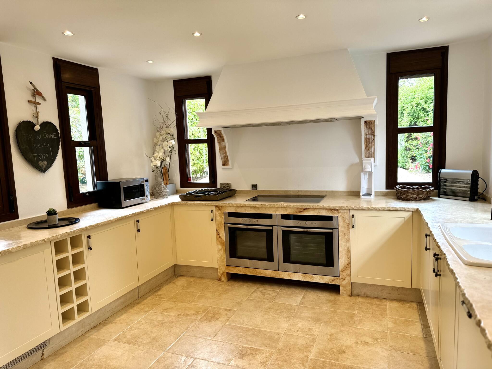 La cocina está equipada con modernos electrodomésticos y cuenta con agua potable del grifo. Esta planta baja da acceso directo a la piscina privada climatizada de agua salada y al jardín. También se encuentra en esta planta un dormitorio con baño en suite y un aseo adicional para invitados.