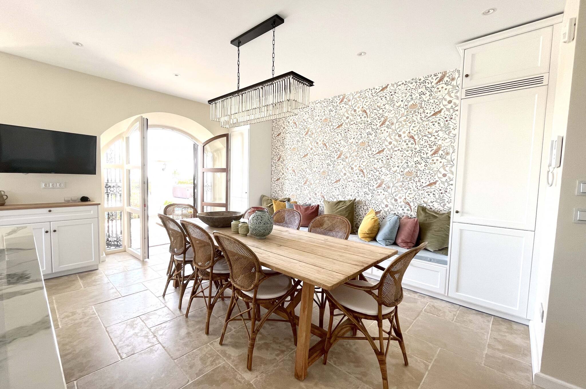 Cuenta con una espectacular cocina abierta y amplias zonas de estar y comedor muy luminosas, con enormes ventanales que se abren a la terraza y a la piscina climatizada, desde donde se accede directamente a la playa.