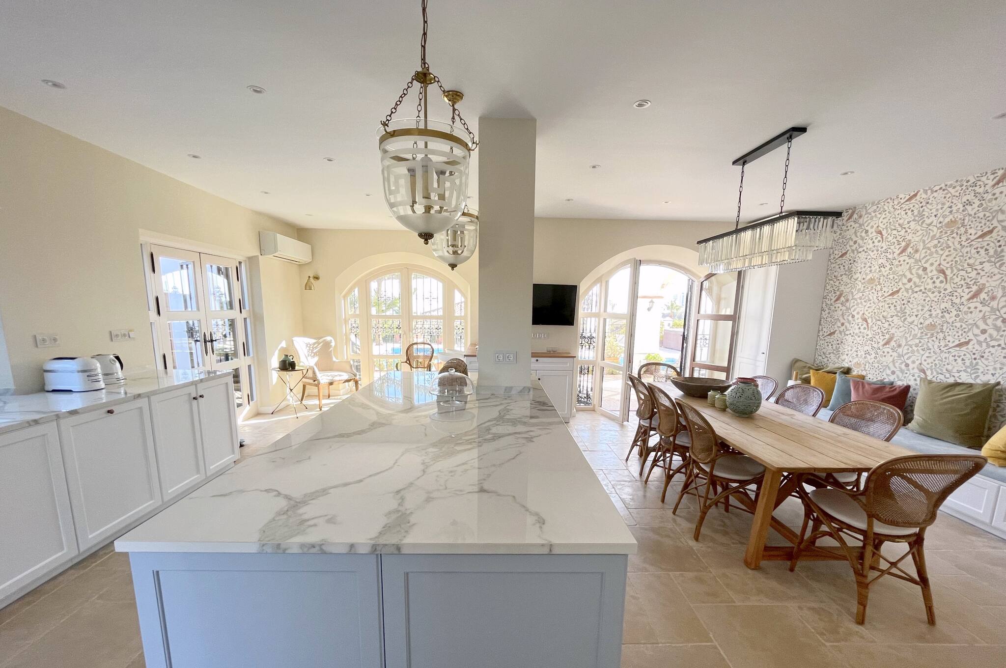 La cocina de tamaño impresionante y más que bien equipada con mesa de comedor tiene una atmósfera cálida. La isla central permite unirse al chef mientras se prepara la cena.