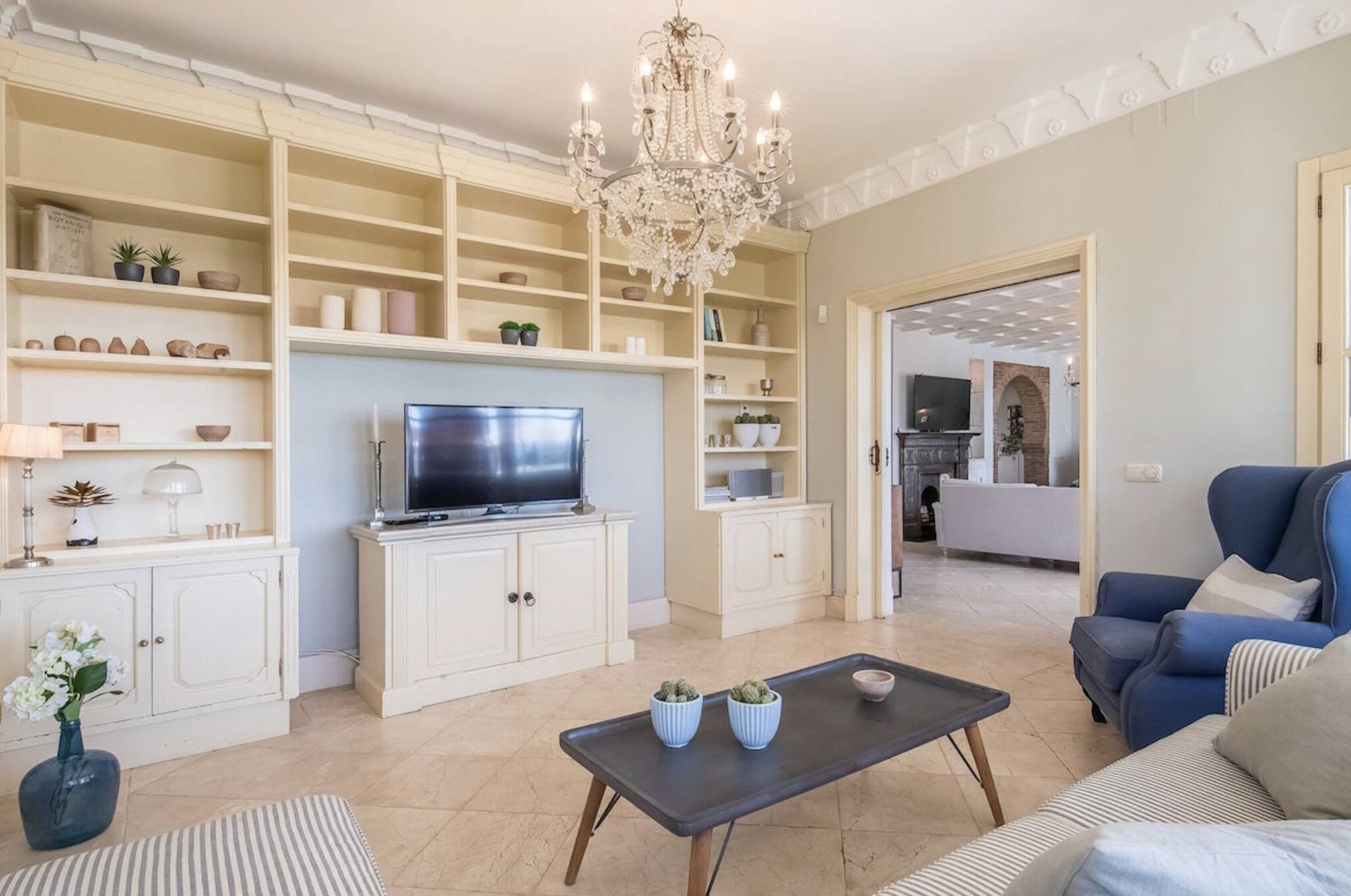 El acogedor salón decorado tiene 2 áreas; una para relajarse y otra para jugar. También desde el salón se tiene acceso a la terraza cubierta y al jardín y la piscina.