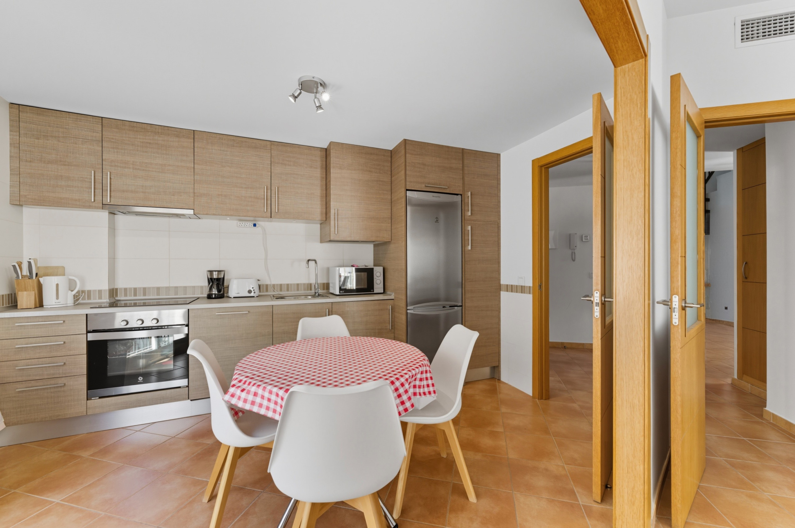 The apartment also includes a second full bathroom with a shower and a fully equipped independent kitchen with modern appliances, perfect for cooking and feeling at home.