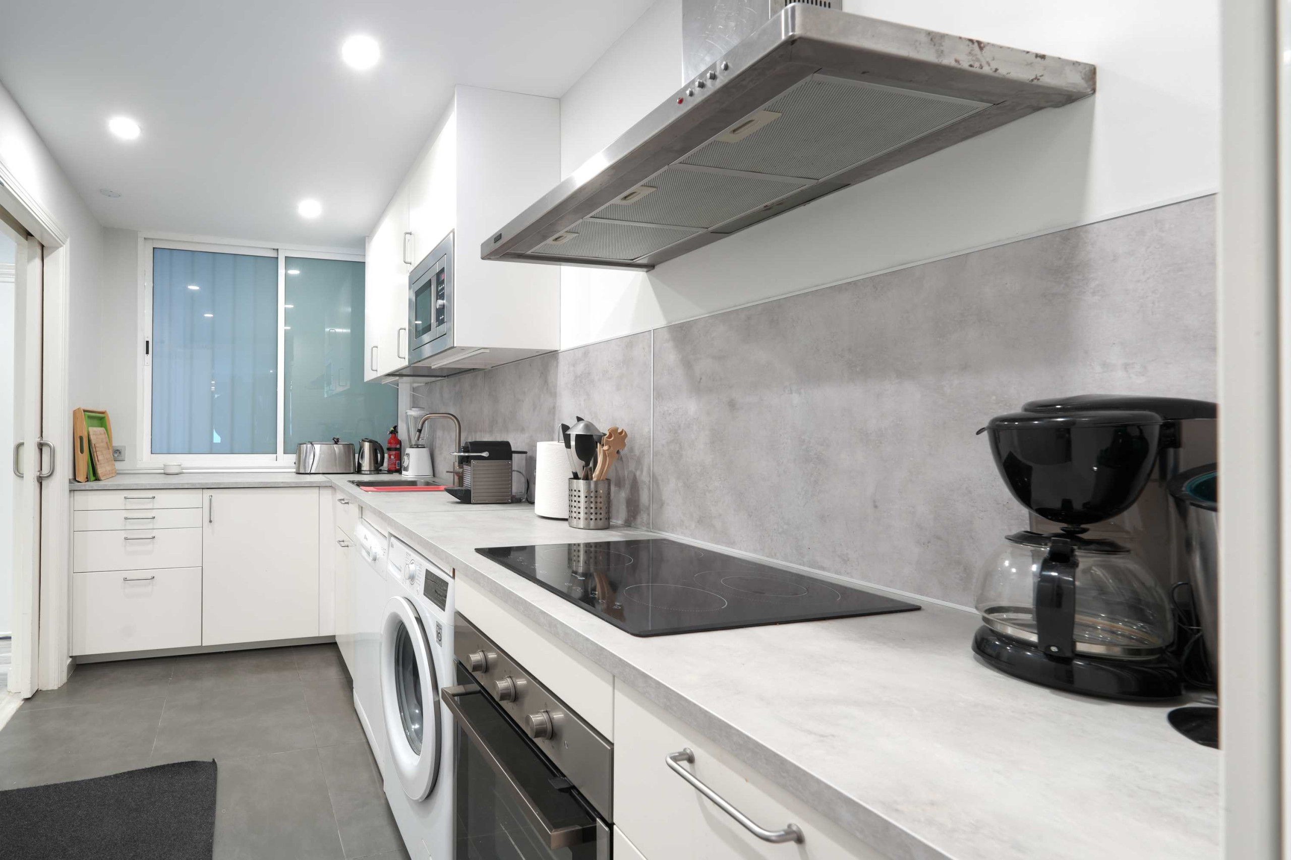 The apartment also includes a second full bathroom with a shower and a fully equipped independent kitchen with modern appliances, perfect for cooking and feeling at home.