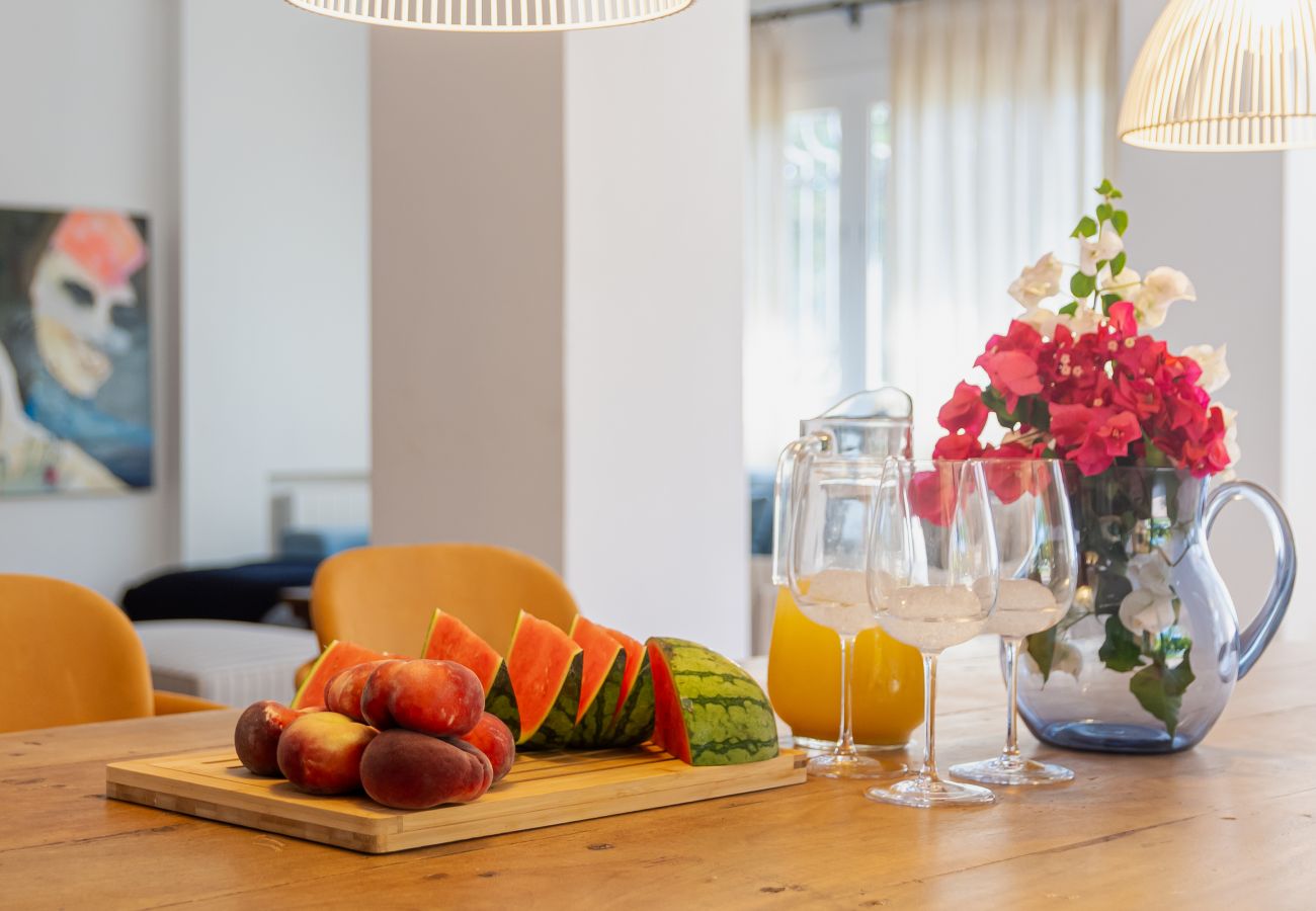 Stepping into the villa, you'll find a spacious open-plan living area with large sliding doors leading to a beautiful outdoor terrace. The living room is elegantly decorated, providing a relaxing atmosphere for family gatherings or entertaining friends. The modern kitchen is fully equipped, seamlessly integrated with the living area, and opens onto the private outdoor terrace where you can enjoy the Mediterranean sunshine.