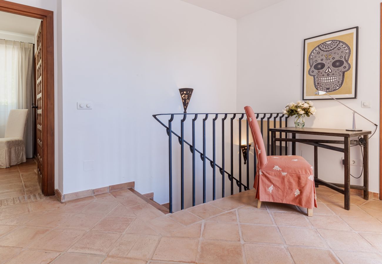 As you enter through the stunning old wooden door, you're greeted by a staircase on the right that leads to the first floor, where you'll find four beautifully appointed bedrooms. The master bedroom features an ensuite bathroom and a large balcony with ample seating space, perfect for relaxing and enjoying the views. There is also a kids' bedroom with two single beds, next to a bedroom with a one person bed; these two share a bathroom. Additionally, there is another bedroom with a double bed and an ensuite bathroom.