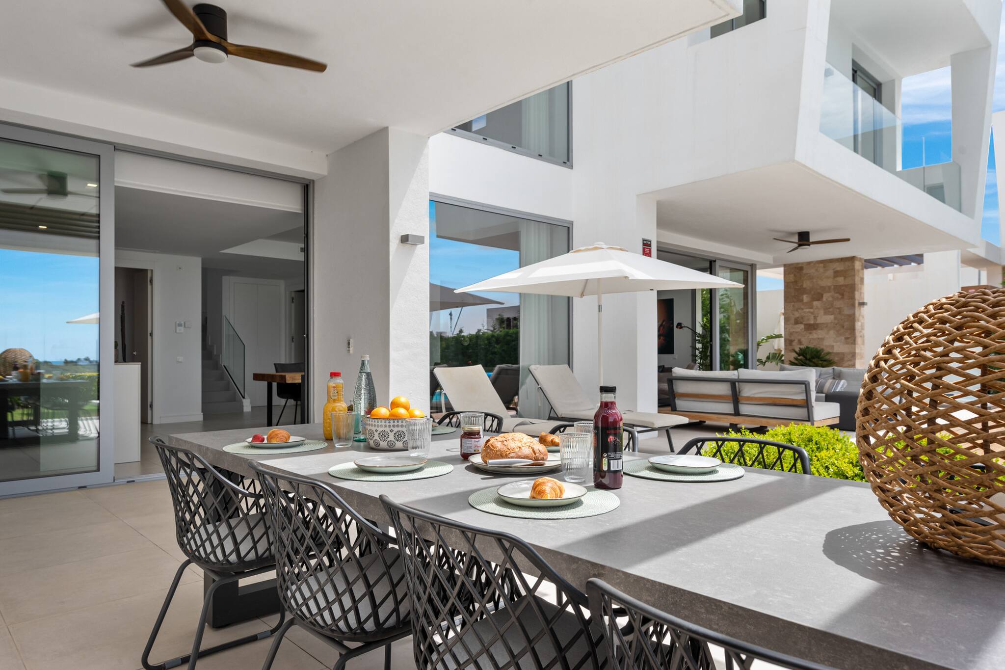 Upstairs are three more bedrooms, all with large balconies and beautiful views of the golf course and the sea. The master bedroom has an en-suite bathroom with shower and bath, while the two other double bedrooms share a bathroom.
