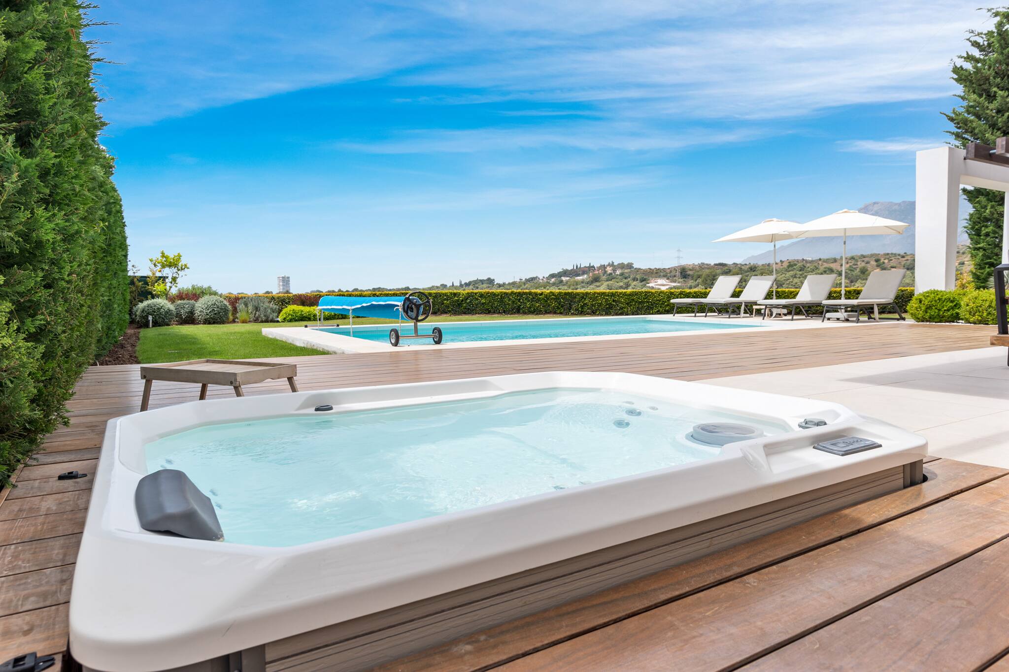 The outside area has ample open and covered terrace space, Jacuzzi and BBQ area with lots of seating and another large area for dining al fresco. You will enjoy the gorgeous landscaped garden with a beautiful pool, which can be heated in the colder months.
